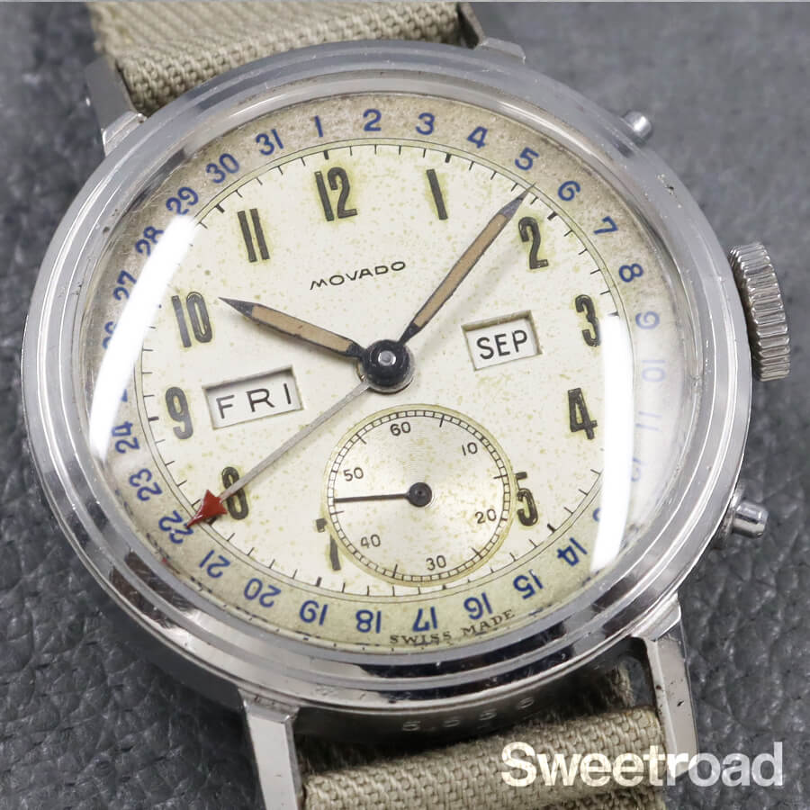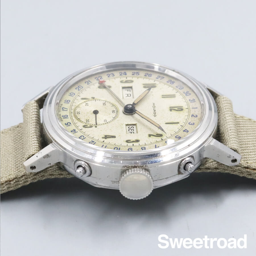 1940年代に製造されたモバードのトリプルカレンダーです。 満遍なくエイジングされたオリジナルのダイヤルに、アラビアインデックスやペンシル針が配されたヴィンテージらしい顔立ちが魅力的な個体です。曜日と月表示が両サイドに分かれており、スモールセコンドも大きめなため、ケースのサイズ感以上に視認性が高いのも特徴です。外装には小傷や使用感がございますが、年式を考えれば良好なコンディションを保っていると言えます。