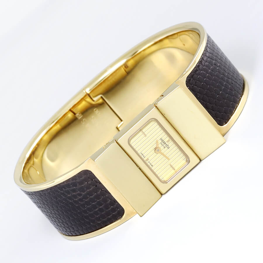 エルメスのバングルウォッチの中でも個性的なモデル「ロケ」。 いくつかのバリエーションが存在しますが、本商品はその中でも高い人気を誇るブラックリザードが使用された個体です。 文字盤をスライドさせることで、リューズの操作やバングルの脱着を行うユニークでありながらも、非常に高いデザイン性も兼ね備えています。 ケースなどに目立った傷みのない「ほぼ未使用品」の状態で、メーカータグが付属いたします。 ゴールドの指輪などと一緒にアクセサリー感覚で緩めに着けると、とても雰囲気が良いと思います。