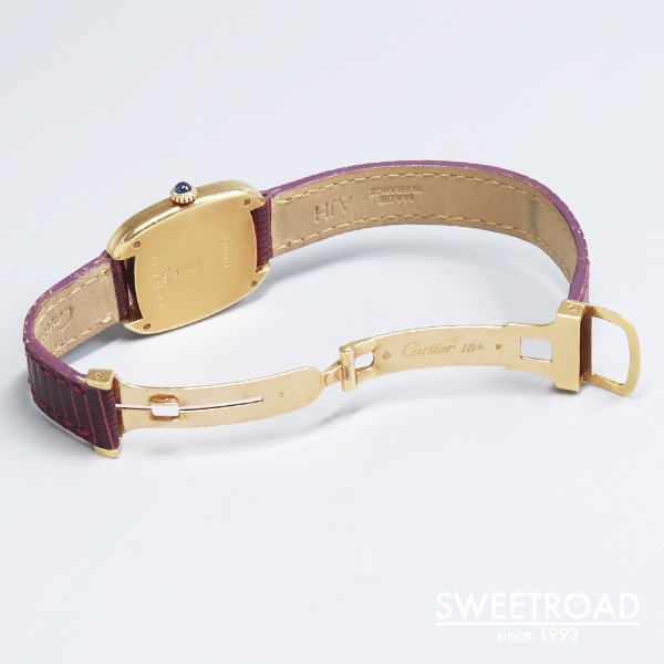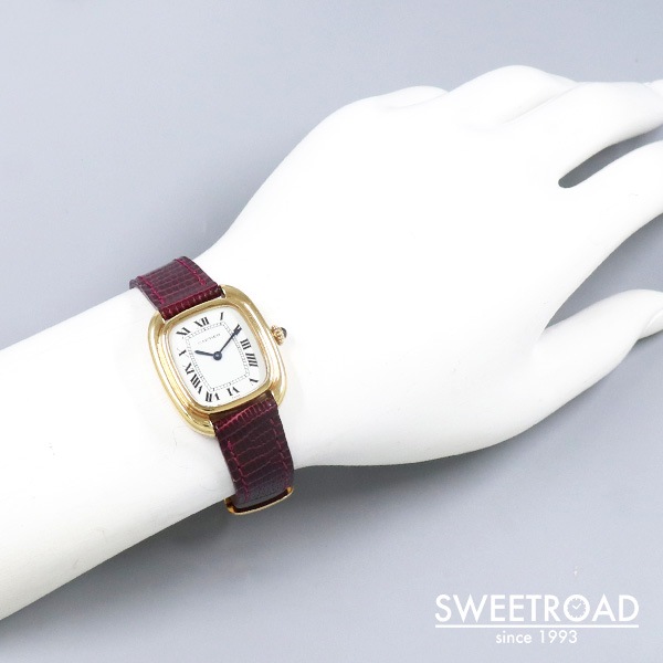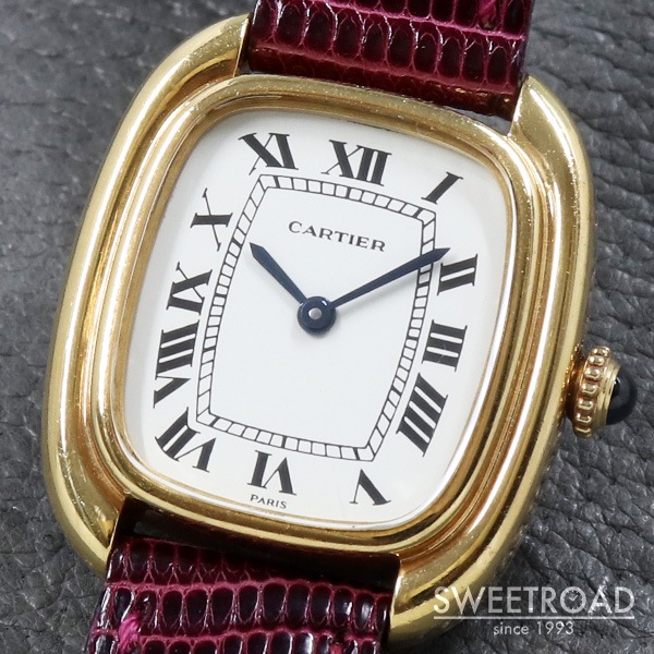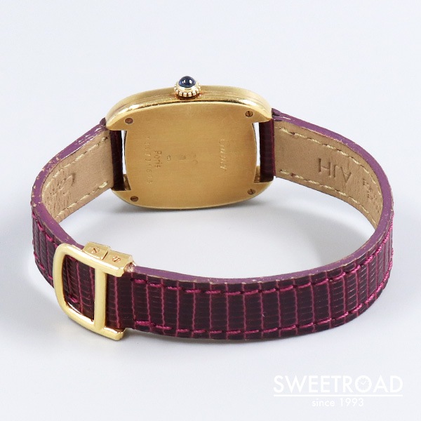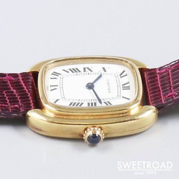 箱型という意味を持つカルティエの「Gondole/ゴンドーロ」が入荷しました。 ケース素材は18KYG。ダブルラインの加工が施されたクッション型のケースにフラットな風防が配された、タンクシリーズに引けを取らない存在感があります。 さらに、文字盤6時位置と裏蓋に表記された「PARIS」の文字は、1970年代後半から80年代初頭のわずかな期間にだけ製造された個体に見られるレアポイントです。 ケースには経年による小傷がございますが、過度な打痕などは見られず、裏蓋の刻印はしっかりと残っています。 カルティエ純正の革ベルトに、希少性が高い18KYG製の純正Dバックルが取り付けれられています。 長さは約15.5cmの状態で、手首周り14.5cmくらいまでの方が装着できます。 搭載のムーブメントは手巻き式なので定期的なメンテナンスを行うことで永く使用することができます。
