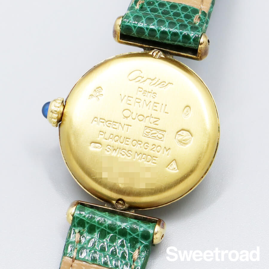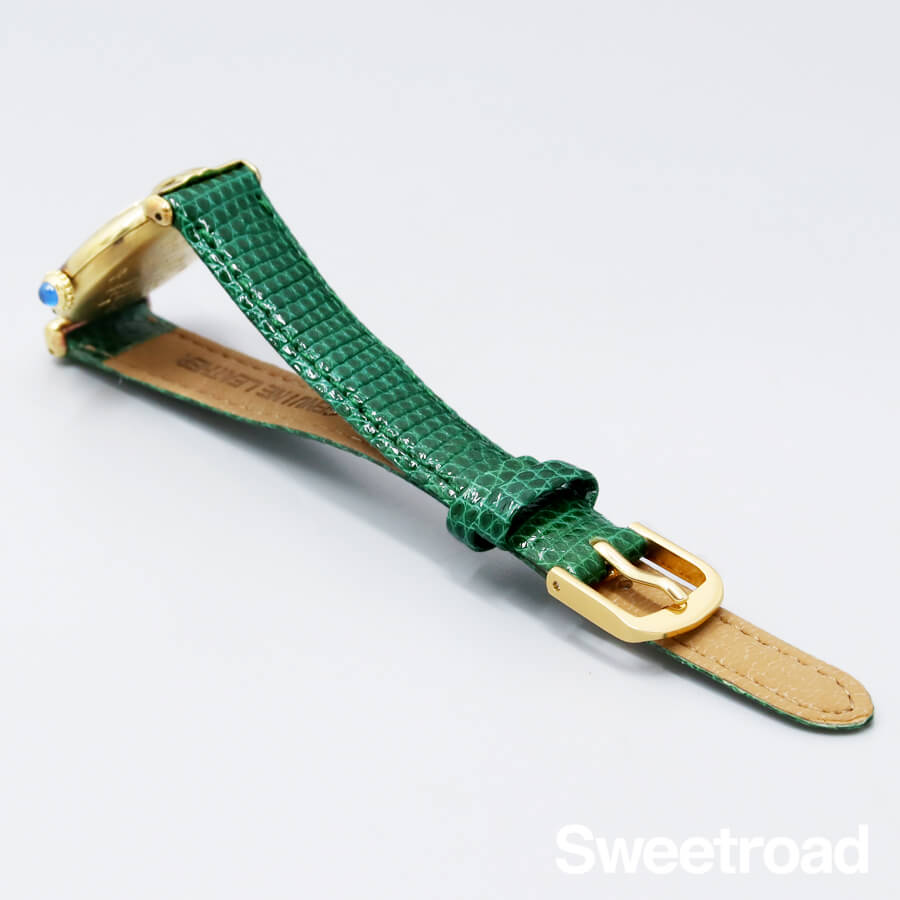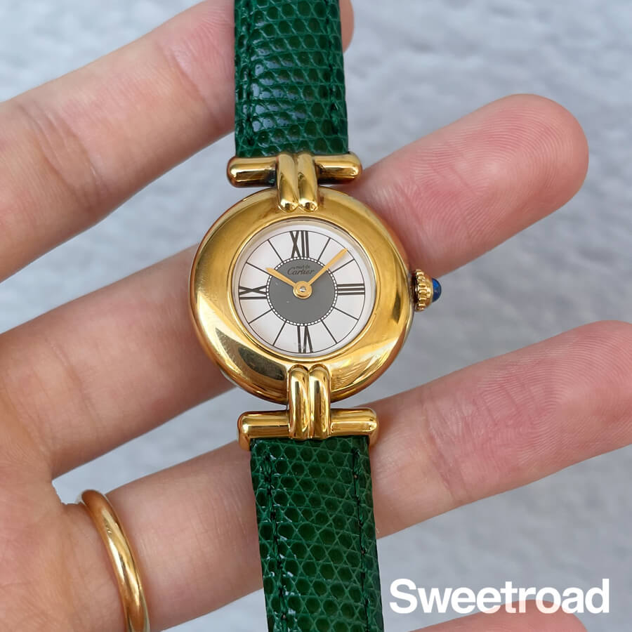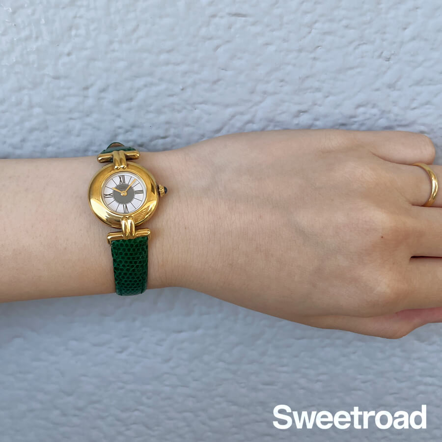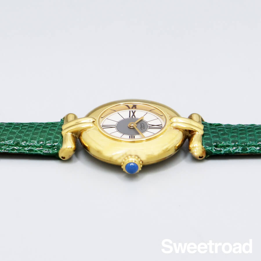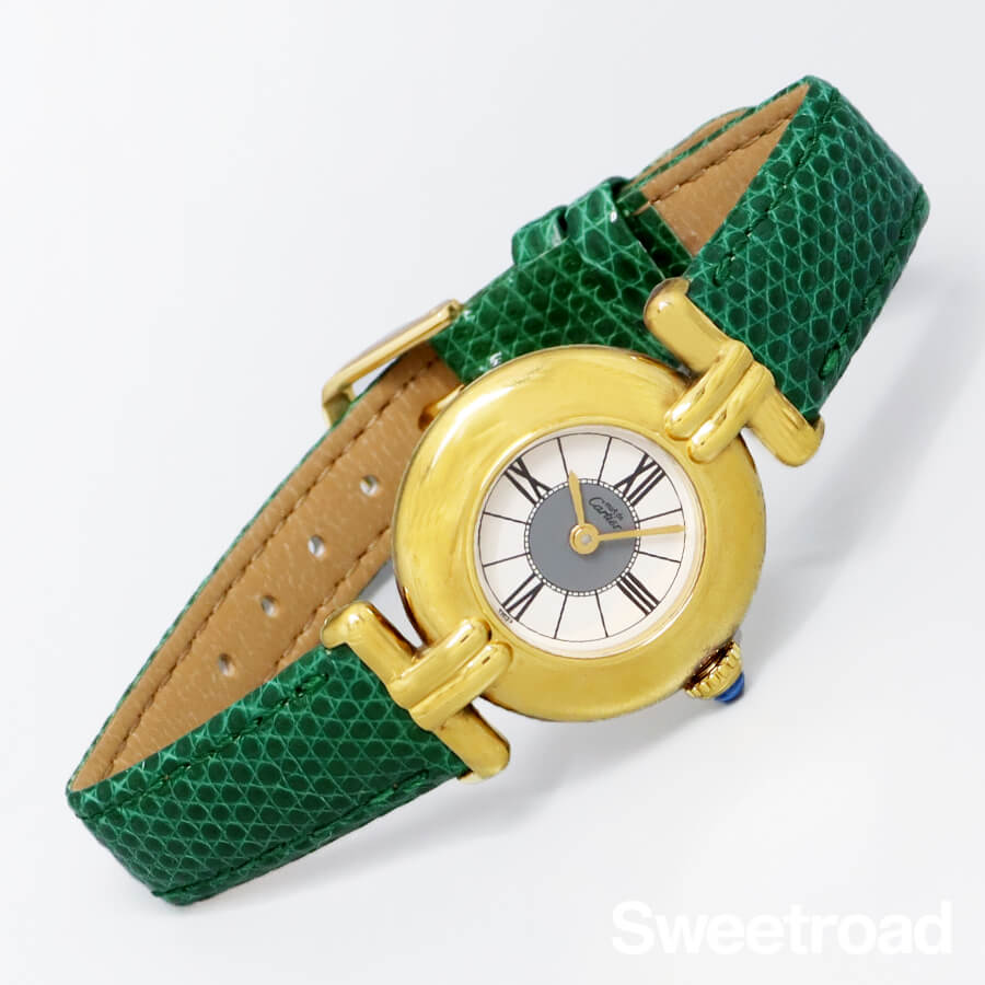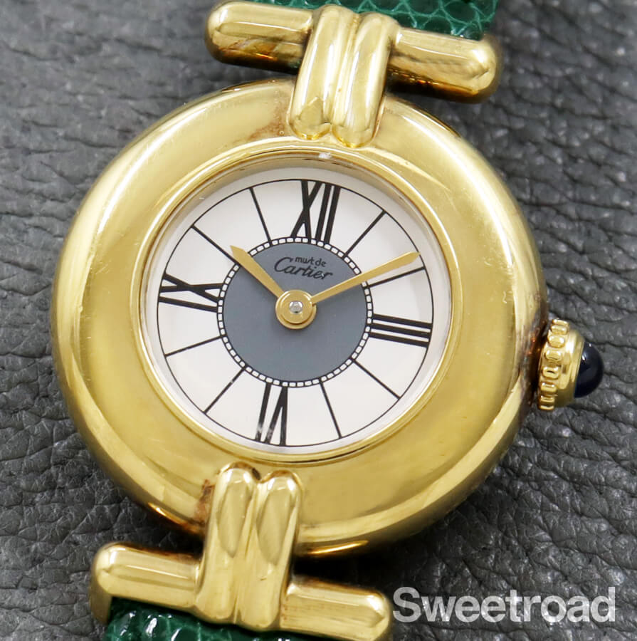 ローマのコロッセオ(円形競技場)から名づけられ、生産が終了した今も根強い支持を得ている「コリゼ」コレクション。 タンクを代表とするレクタンギュラーモデルとは雰囲気が異なる、薄型のラウンドケースが特徴です。 ホワイトとグレーのツートンカラーが目を惹くローマンダイヤルに、ゴールドの針が非常に高級感がある顔立ち。 文字盤は全体的に目立つような傷みはございません。 ケースはスターリングシルバー(銀無垢)に20ミクロンもの金を貼り付けて作られたカルティエを代表する「ヴェルメイユケース」が採用されており、外装には若干の使用感がございますが、メッキの剥がれなど見られない良好なコンディションです。 ベルトはBAMBI社製のリザードベルトを装着しています。