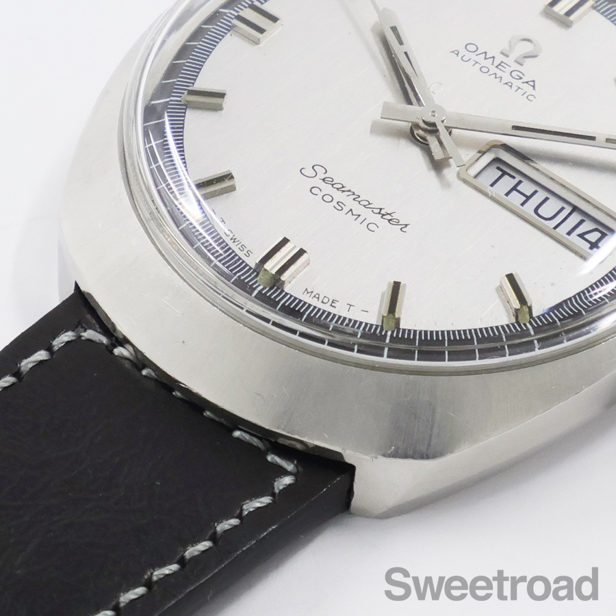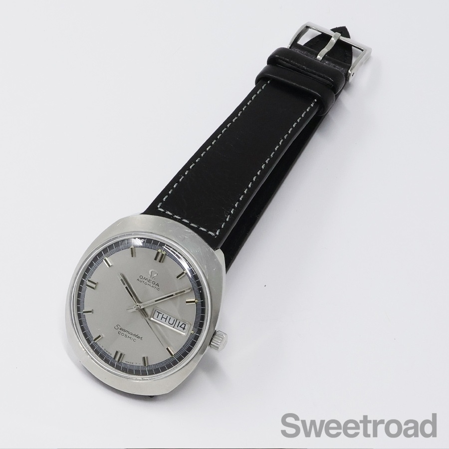 宇宙を意味するペットネームが与えられた「シーマスター ・コスミック」。特徴的なワンピースケースが採用されており、ケースと裏蓋が一体化したことで裏面からの水気の浸入を防ぐ作りになっています。本商品は希少なサテンダイヤルが採用されており、曜日がドイツ語表記という珍しい個体です。外装には経年による小傷がございますが、ケースバックのシーホース刻印がしっかりと残っている良好な状態を保っています。ベルトはアキュレイトフォルムのレザーベルトを装着しています。