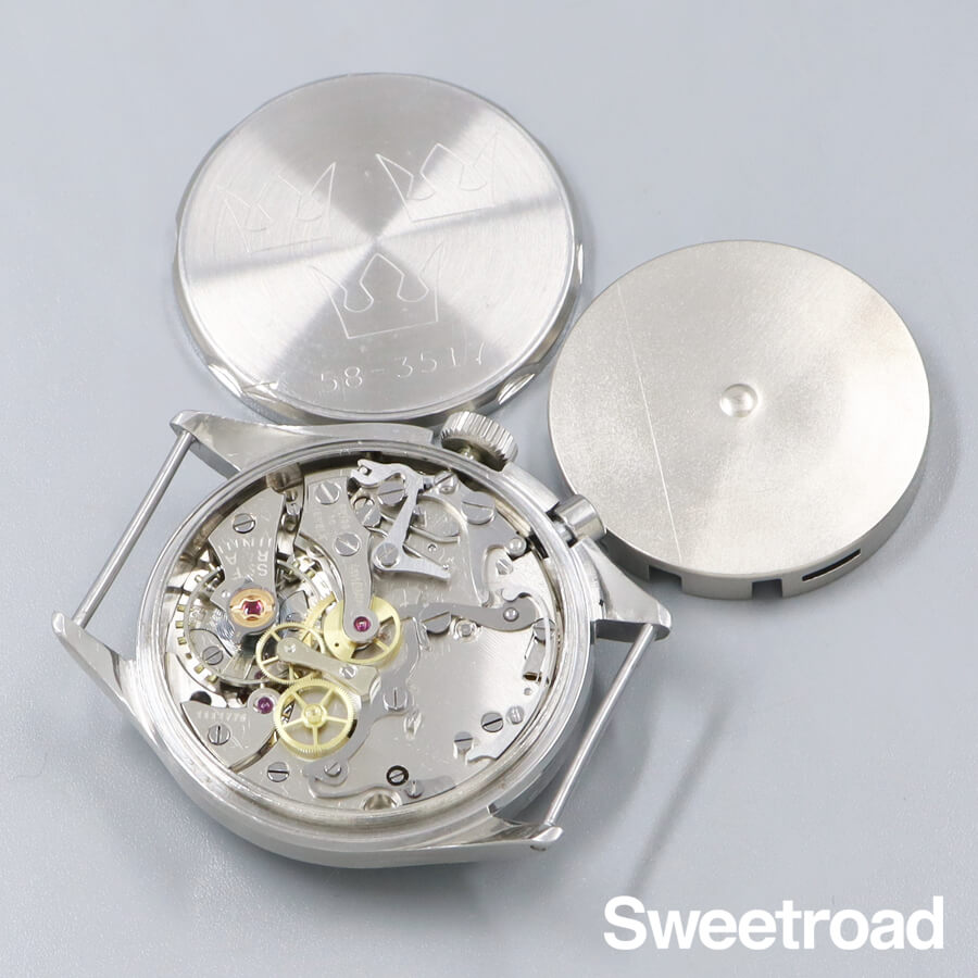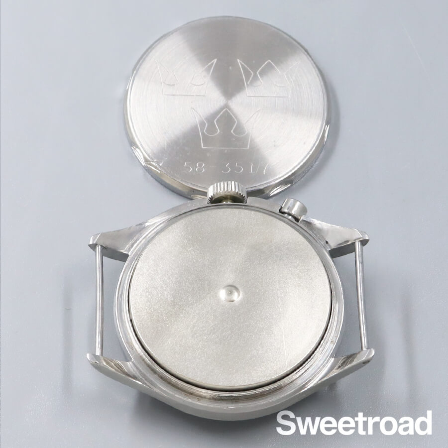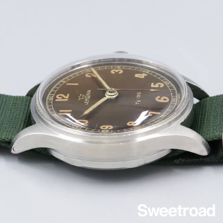 幻とも言われている超貴重な「レマニア・スウェーデン空軍用」のモデルです。 経年により雰囲気良くブラウンチェンジしたオリジナルのダイヤルが魅力的な、ヴィンテージ感抜群な個体です。針の夜光は後年に修復されていますが、ほとんど気になりません。文字盤6時下にある「Tg」とは、スウェーデン語で「Tid Givare(時間を与える)」の略。 2時位置のプッシュボタンを押すと、ハック機能と秒針の帰零が行われ、リューズが飛び出ます。 そしてリューズを押し込むと、また時を刻むという非常に面白い仕組みが採用されています。 ボリュームのあるリューズガードが目を引く非対称デザインのケースも素晴らしく、裏蓋にはスウェーデン軍のマーク「スリークラウンズ」が刻印されています。全体的に経年を感じる部分も含め、ミリタリーウォッチならではの良さが随所に現れている逸品です。 ベルトはフェニックス製のNATOベルトを装着しています。