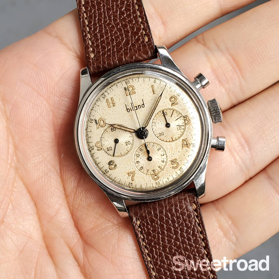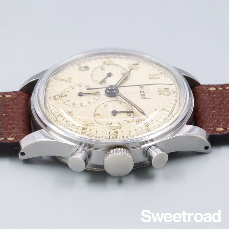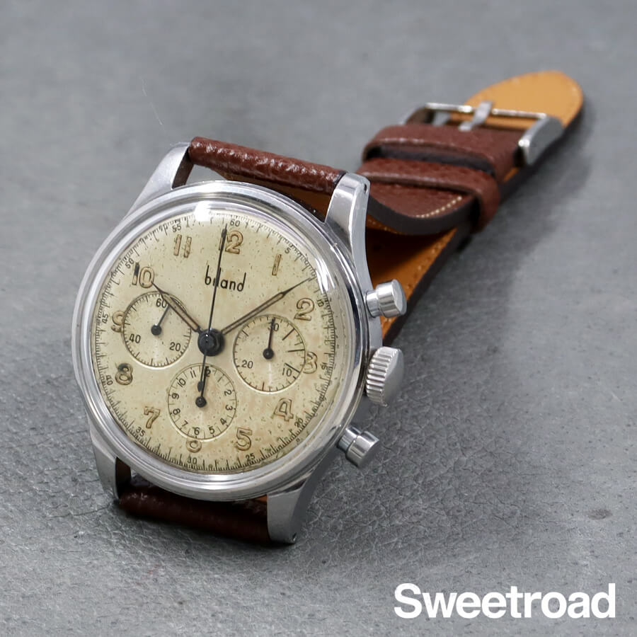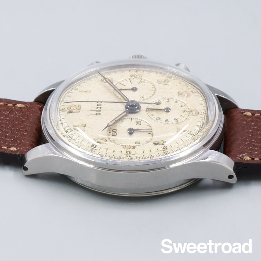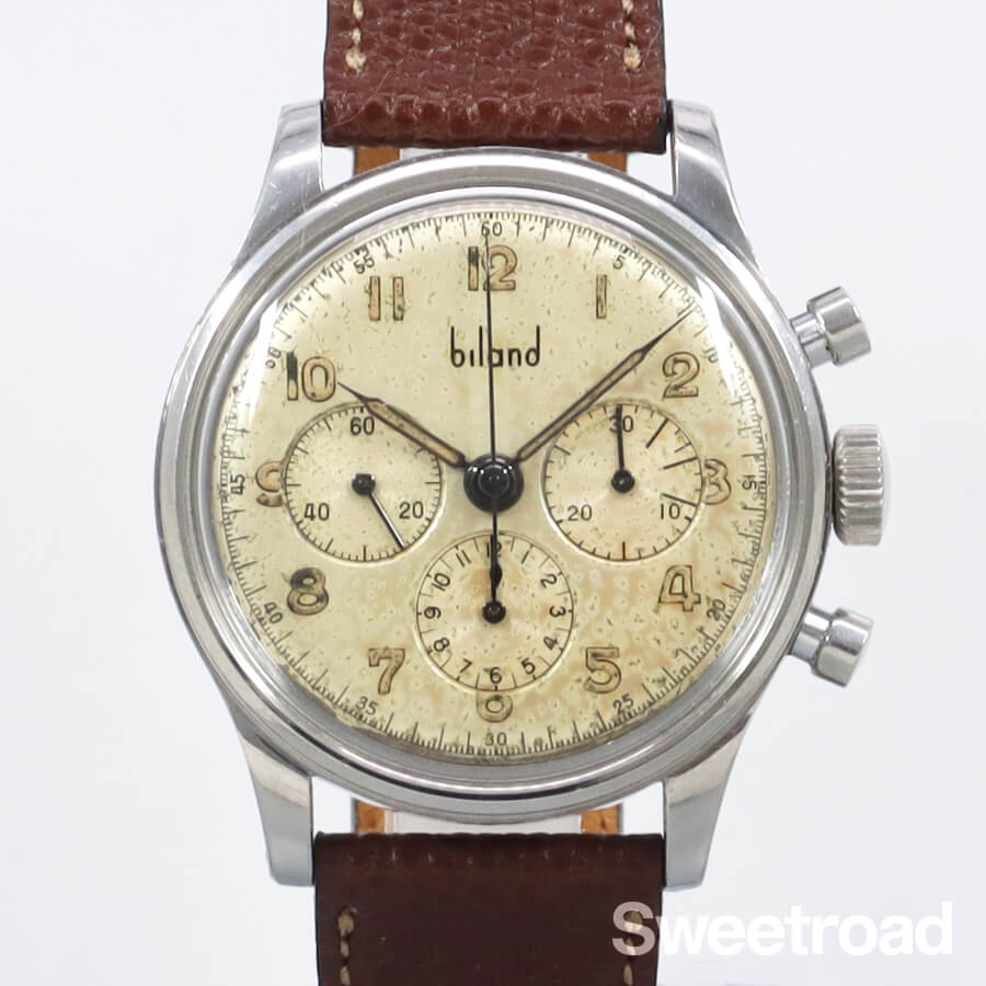 かつて存在したスイスの時計メーカー「BILAND/ビランド」。 1914 年にベルンで開催されたスイス国立博覧会で金メダルを受賞したこともあり、当時としては非常に高品質な機械を製造していたことでも知られています。 ムーブメントにはスピードマスターにも搭載されたCal.321の前身となる「Cal.27CHRO C12」を搭載しており、3レジスター仕様のバランスの取れたデザインが魅力的です。 経年により雰囲気良く焼けたオリジナルのダイヤルに、アラビアインデックスや針の夜光も当時のままの状態を保っています。外装にはステンレススチールが使用されており、中々肉厚で重厚な佇まいをしています。 小傷などがございますが、プッシャーやリューズの操作感は良好です。 ベルトはアキュレイトフォルムのレザーベルトを装着しています。