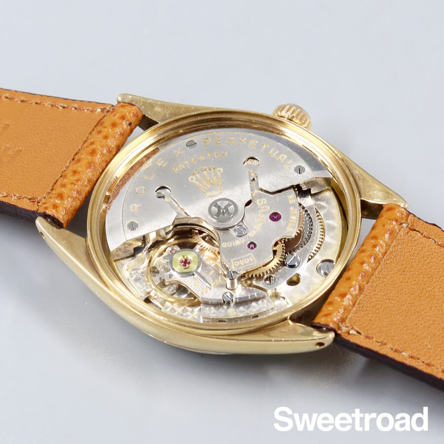 ロレックスの中でも大変希少性が高い、オイスターパーペチュアル/Ref.6567が入荷しました。 ケース素材には18金イエローゴールドが使用されており、経年による若干の使用感こそあるものの、過度な打痕や深い傷が見られず、ベゼルの刻みはしっかりと残った良好な状態を保っています。 文字盤の雰囲気も素晴らしく、アラビア数字とクサビインデックスが配された「エクスプローラーダイヤル」と呼ばれる、人気と珍しさが両立するデザインが採用されています。 3時位置や夜光の周りに少し傷みがございますが、70年前に作られた個体としては十分すぎるくらいの良コンディションかと思います。 ムーブメントは独特なバタフライローターが目を惹く、ロレックス初の両方向巻上げ自動巻モデル/Cal.1030(テンサーティー)を搭載しています。 ベルトはアキュレイトフォルムのレザーベルト(社外製尾錠)を装着しています。