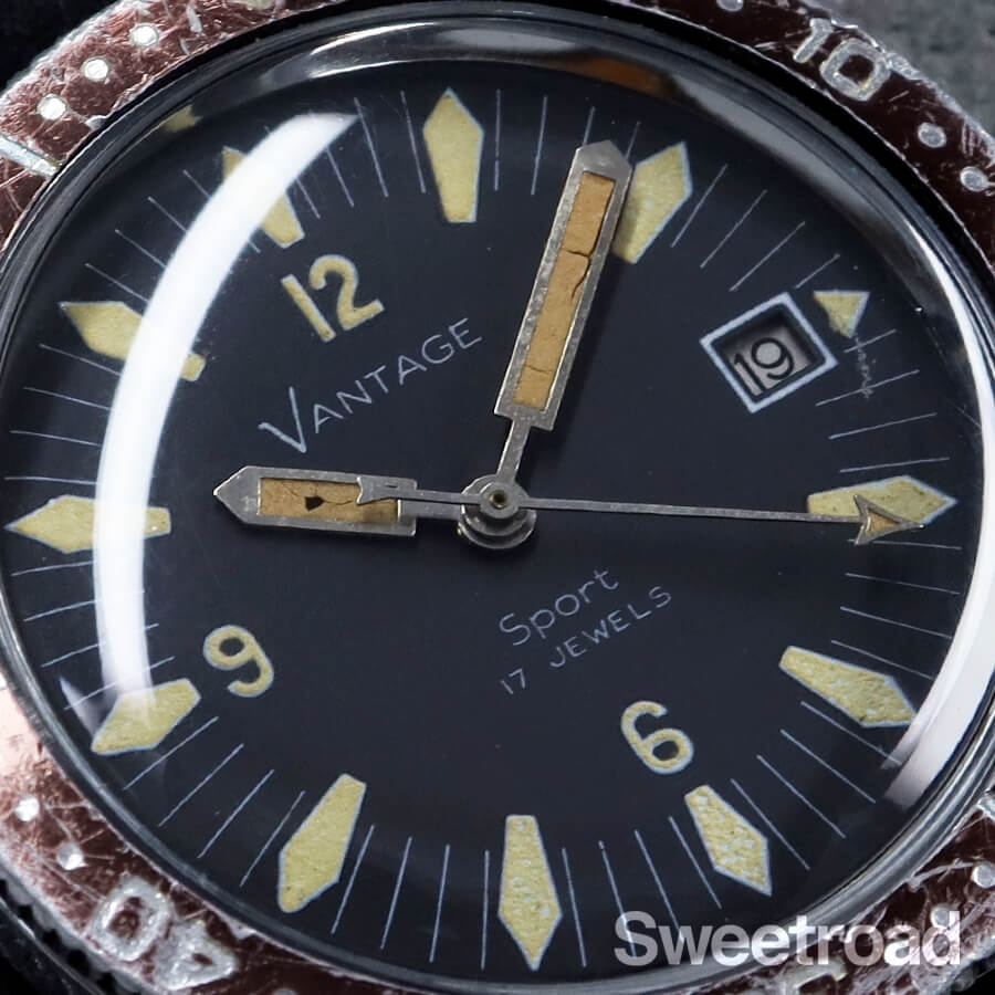 1960年代に製造された「ヴァンテージ」の手巻きダイバーズモデル。 ヴァンテージは、米国ハミルトン社傘下の「STANDARD TIME.Co」の商標で、廉価版ダイバーズモデルとして販売されていました。 本商品は、マットな質感のブラックダイヤル、経年によりブラウンに褪色した回転ベゼル、エッジの効いたトノー型ケースと、ヴィンテージらしい無骨な一本です。 文字盤には目立つような傷みはなく、雰囲気良くエイジングされています。 長針・短針の夜光に剥がれやひび割れがありますが、当時のトリチウム夜光をあえて残しています。外装には年式相応の使用感、ベゼルには傷や打ち傷などがありますが、ケースエッジや裏蓋の刻印は残っています。 ムーブメントはセイコーの17石フェアウェイ系を搭載しています。ベルトはアキュレイトフォルムのレザーベルトを装着しています。