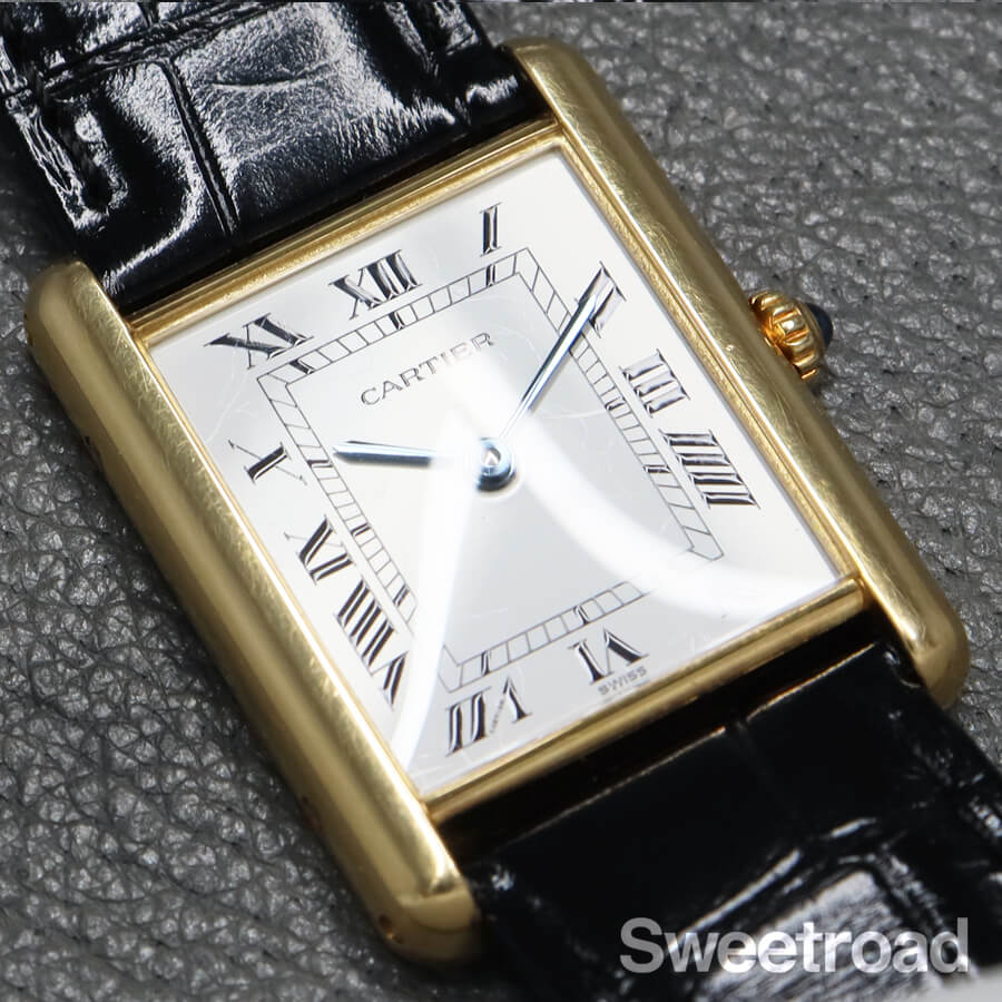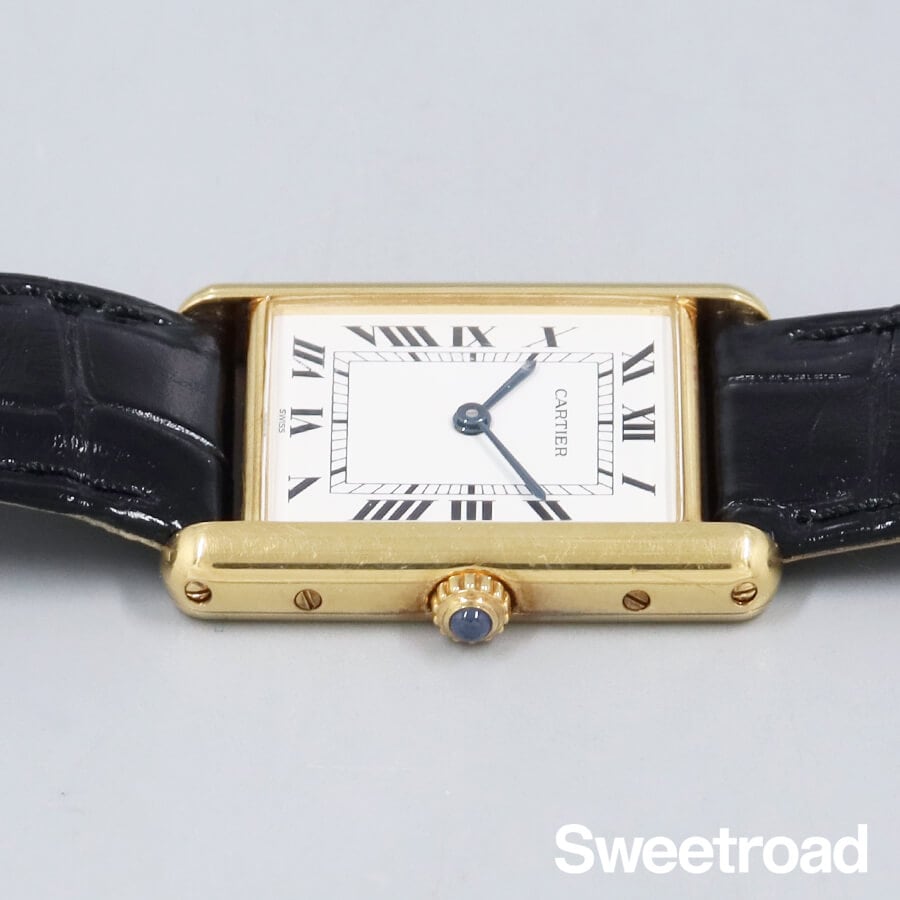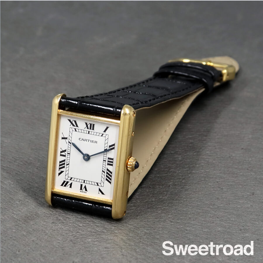 18金イエローゴールド無垢が使用された、カルティエ・タンクの中でも特に希少性の高いモデルです。 LMサイズのメンズモデルではありますが、ユニセックスなアイテムですので気にせずご使用いただけます。 エナメルホワイトのローマンダイヤルにブルースチール針が配された、非常にカルティエらしい顔立ちが採用されており、文字盤には細かなクラックが現れていますが、着けていてあまり気にはならないかと思います。 ケースには経年による若干の金灼けや小傷こそございますが、目立つようなダメージの見られない良好な状態を保っています。 さらに、カルティエ純正のレザーベルトに純正の尾錠が取り付けられている、希少性の高さも魅力的なポイントです。