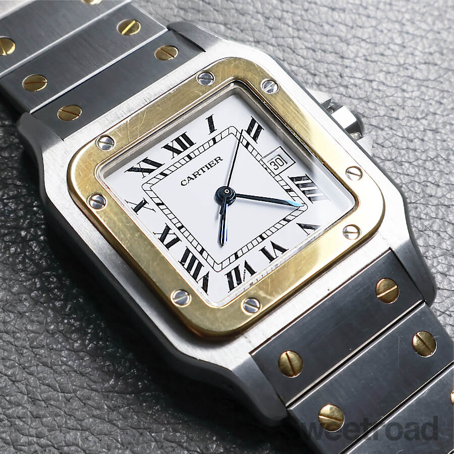 ホワイトローマンダイヤルにブルースチール針が配された、カルティエらしい上品な顔立ちが目を惹き、イエローゴールド製のベゼルも相まって高級感漂う逸品です。