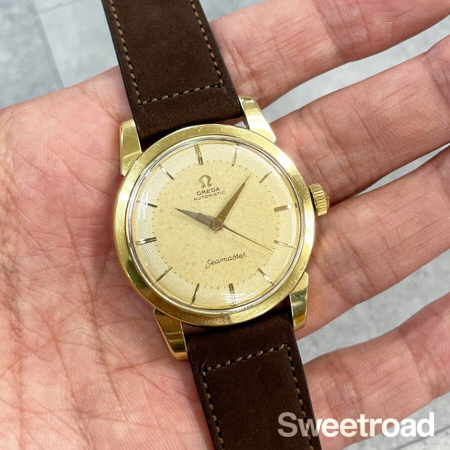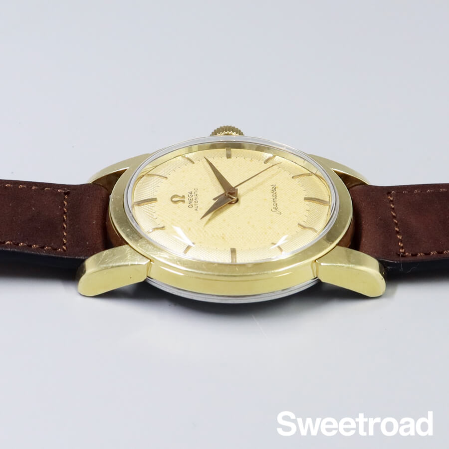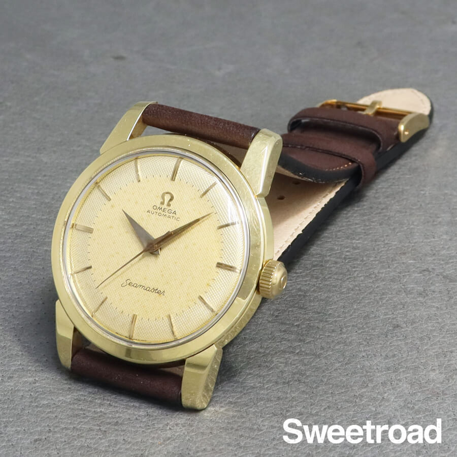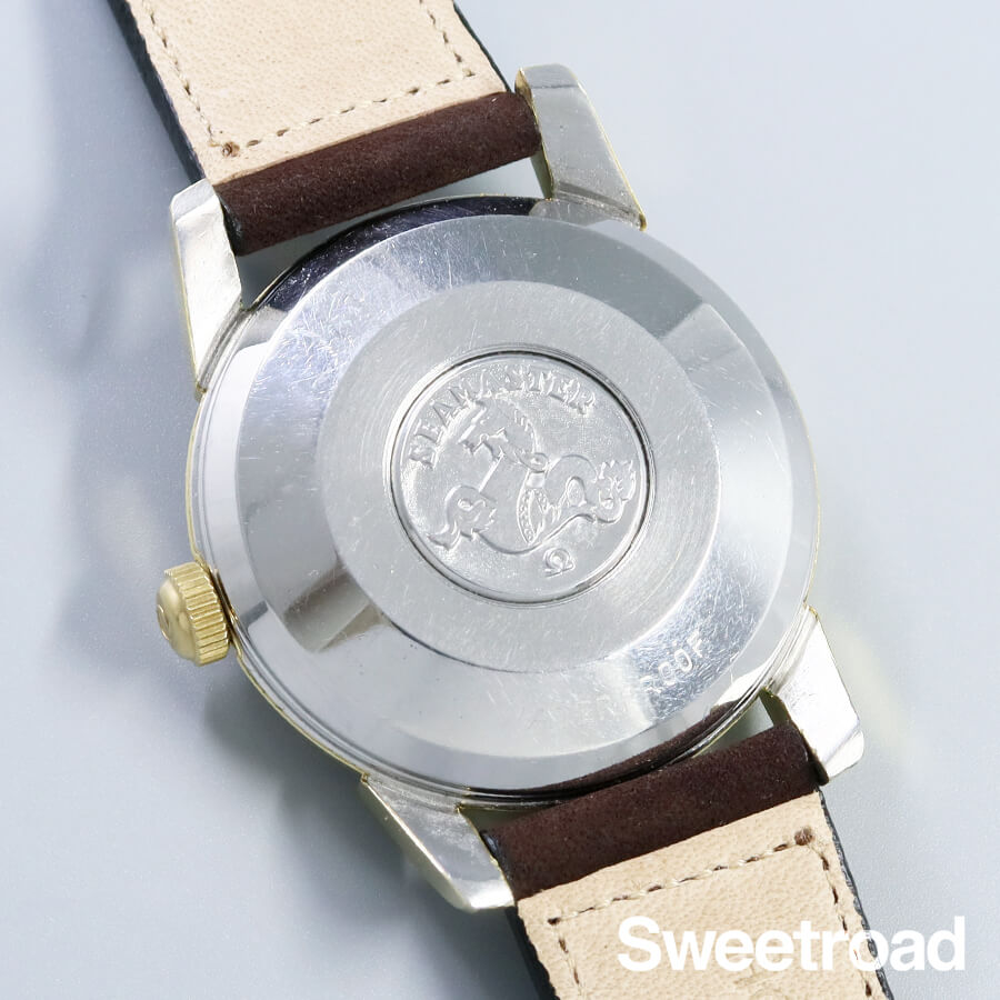 1958年に製造されたオメガ・シーマスターのヴィンテージモデル。 ツートン仕様のギョーシェダイヤルに、ドーフィンハンドが配されたヴィンテージらしいディティールが目を惹きます。 ツートンダイヤルの内側部分に経年が現れており、針に腐食などが見られますが、雰囲気良くエイジングされ、魅力的な顔立ちになっています。 金張りの外装には小傷こそありますが、目立つようなダメージや剥がれはなく、ケースボリュームや裏蓋のシーホース刻印もしっかりと残っています。 ベルトはアキュレイトフォルムのレザーベルトを装着しています。
