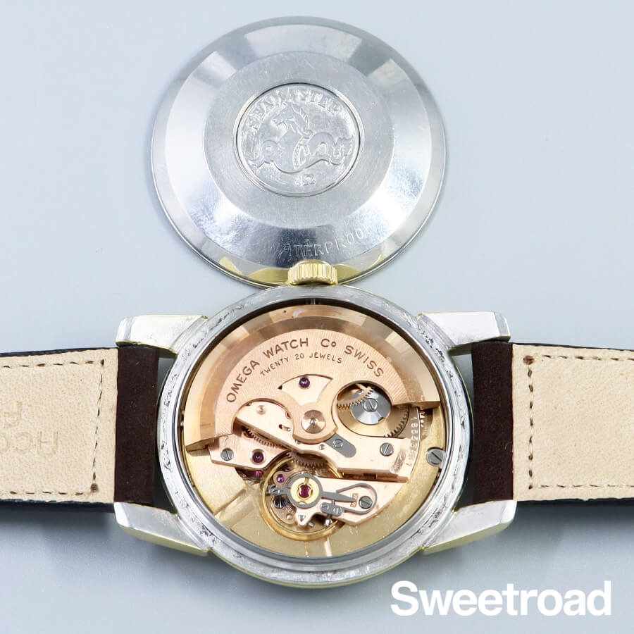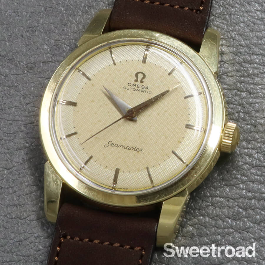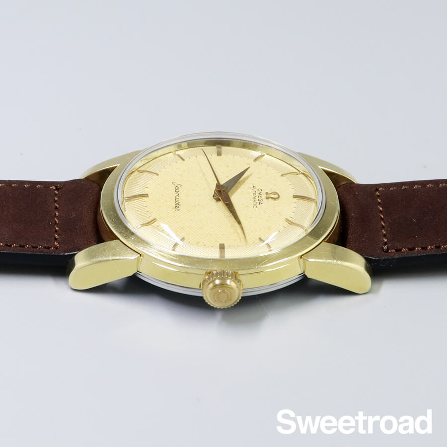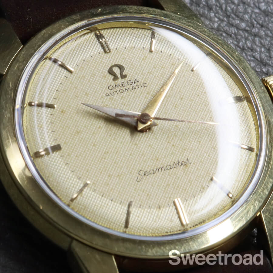 1958年に製造されたオメガ・シーマスターのヴィンテージモデル。 ツートン仕様のギョーシェダイヤルに、ドーフィンハンドが配されたヴィンテージらしいディティールが目を惹きます。 ツートンダイヤルの内側部分に経年が現れており、針に腐食などが見られますが、雰囲気良くエイジングされ、魅力的な顔立ちになっています。 金張りの外装には小傷こそありますが、目立つようなダメージや剥がれはなく、ケースボリュームや裏蓋のシーホース刻印もしっかりと残っています。 ベルトはアキュレイトフォルムのレザーベルトを装着しています。