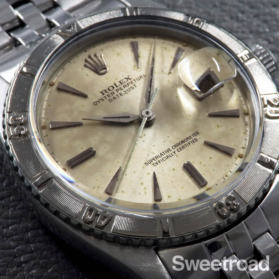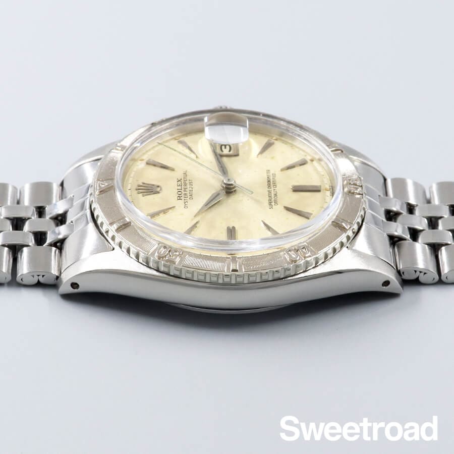 ホワイトゴールド製の回転ベゼルが装備された、サンダーバードの3代目となる/Ref.1625。 本商品は1625の中でも初期に製造された個体で、ドルフィンハンドやクサビインデックスが配された、ヴィンテージらしいディティールが目を惹きます。 オリジナルのシルバーダイヤルは、全体的にエイジングが現れておりますが、ヴィンテージ感抜群の雰囲気に仕上がっています。 ケースは後年に外装仕上げが施されており、ミドルケースは綺麗な状態です。 ポリッシュによる若干の丸みは感じ取れますが、過度な痩せやダレはなく、WG製ベゼルのエッジもしっかりと残っています。 ベルトは貴重な20mm幅のロレックス純正ジュビリーブレスを装着しています。