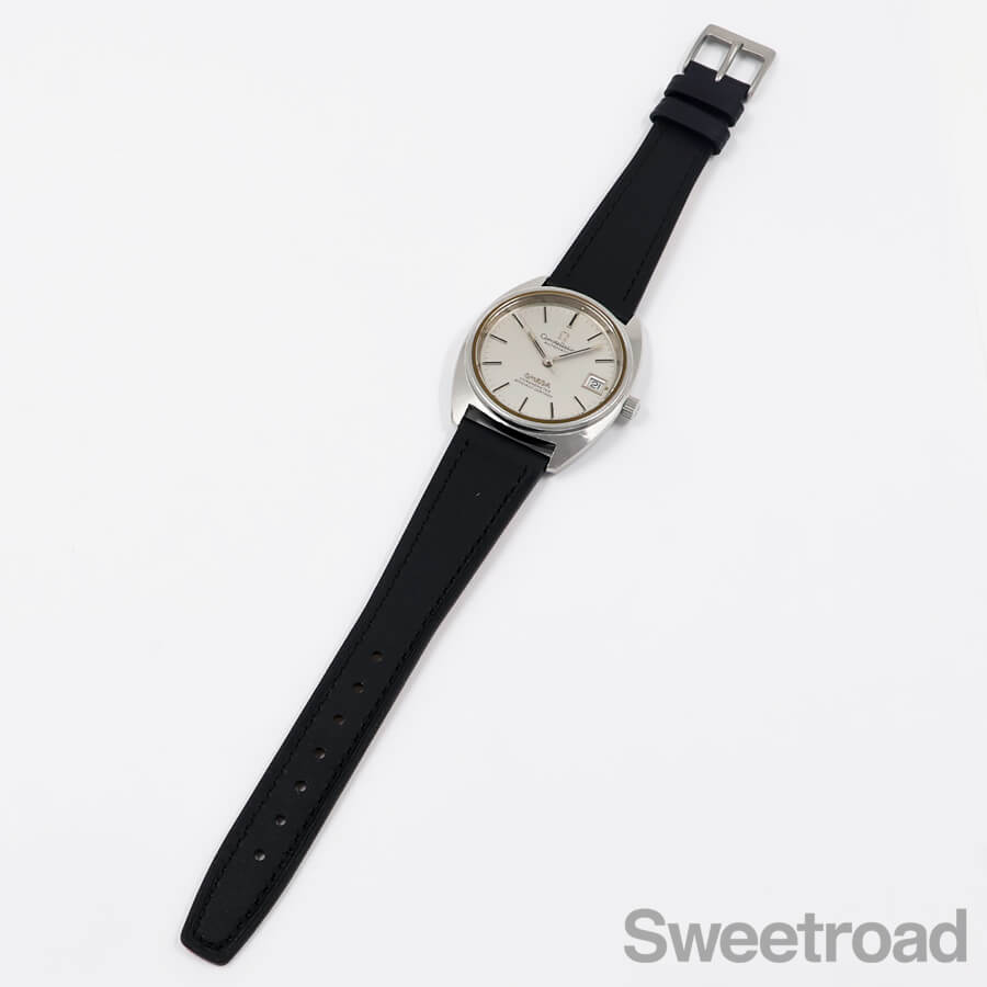 本商品は、OMEGAロゴやクロノメーター表記が6時側に配され、フラットなガラス風防が採用された後期型に位置するモデルです。