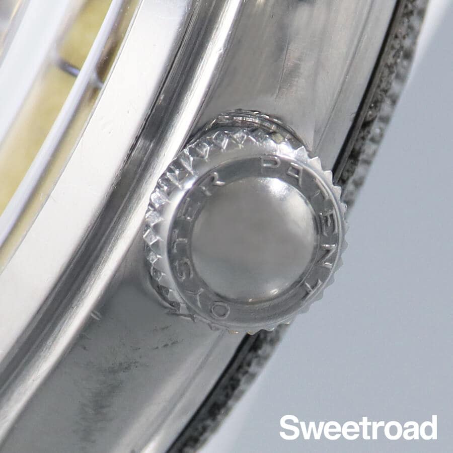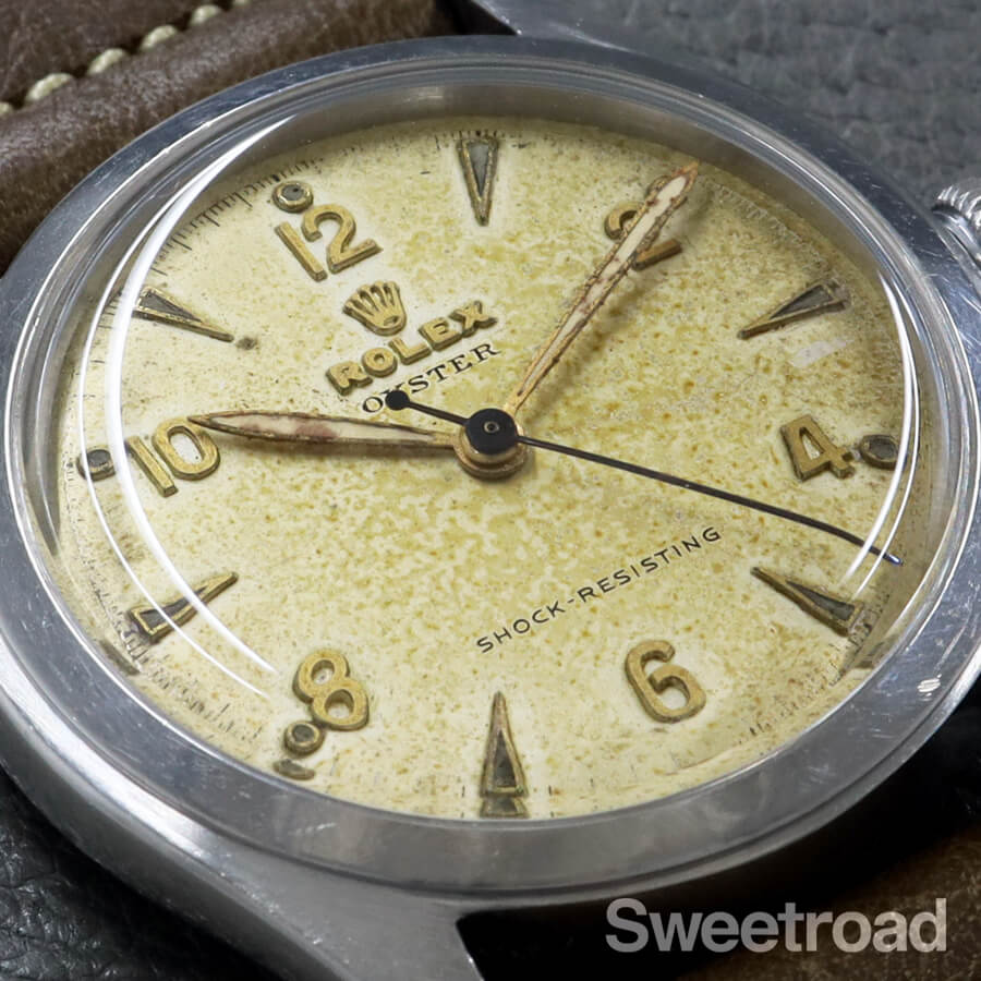 1948年に製造されたロレックスのヴィンテージモデル「オイスター/Ref.4499」が入荷しました。 本商品は、抜群の雰囲気にエイジングされたオリジナルのパウダーダイヤルが目を惹く個体です。 また、アラビア数字とクサビインデックスが交互に並んでおり、リーフハンドやブルースチール秒針といった、ヴィンテージロレックスならではのディティールも魅力的です。 ケースには若干の小傷や丸みが感じられますが、過度なダメージは見られず、「OYSTER PATENT」刻印の貴重な純正リューズが付いています。 ベルトはスイートロードオリジナルのイタリアンオイルレザーベルトを装着しています。