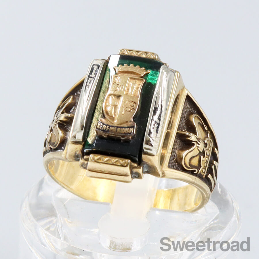 1951年に設立された、アメリカ・ワシントン州にある「Kent-Meridian High School/ケント・メリディアン高校」のカレッジリングです。 創業120年を誇る米国最大の記念品製造メーカー・ジャスティン社が制作したモデルで、素材には10金イエローゴールドが使用されており、美しいカッティングが施されたスクエア型のストーンが配された70年代らしいアイテムです。 ベゼルやリングサイドの彫り込みも深く細かいデザインが施されています。 経年による若干の小傷がございますが、雰囲気を損なうような打痕などが見られない良好なコンディションを保っています。
