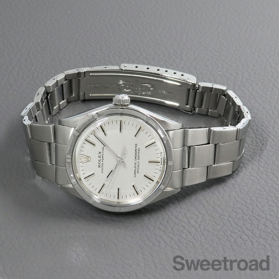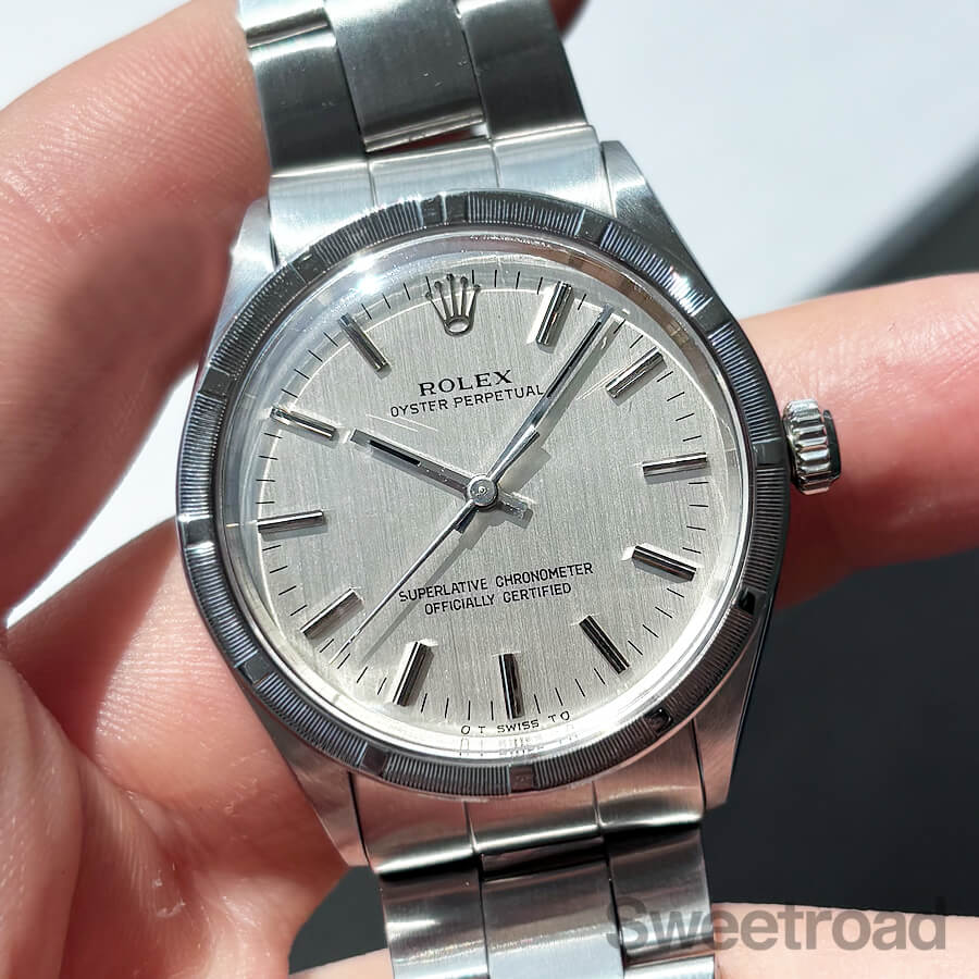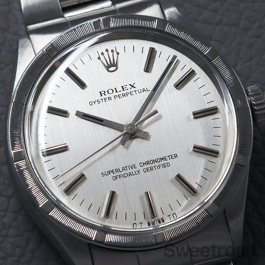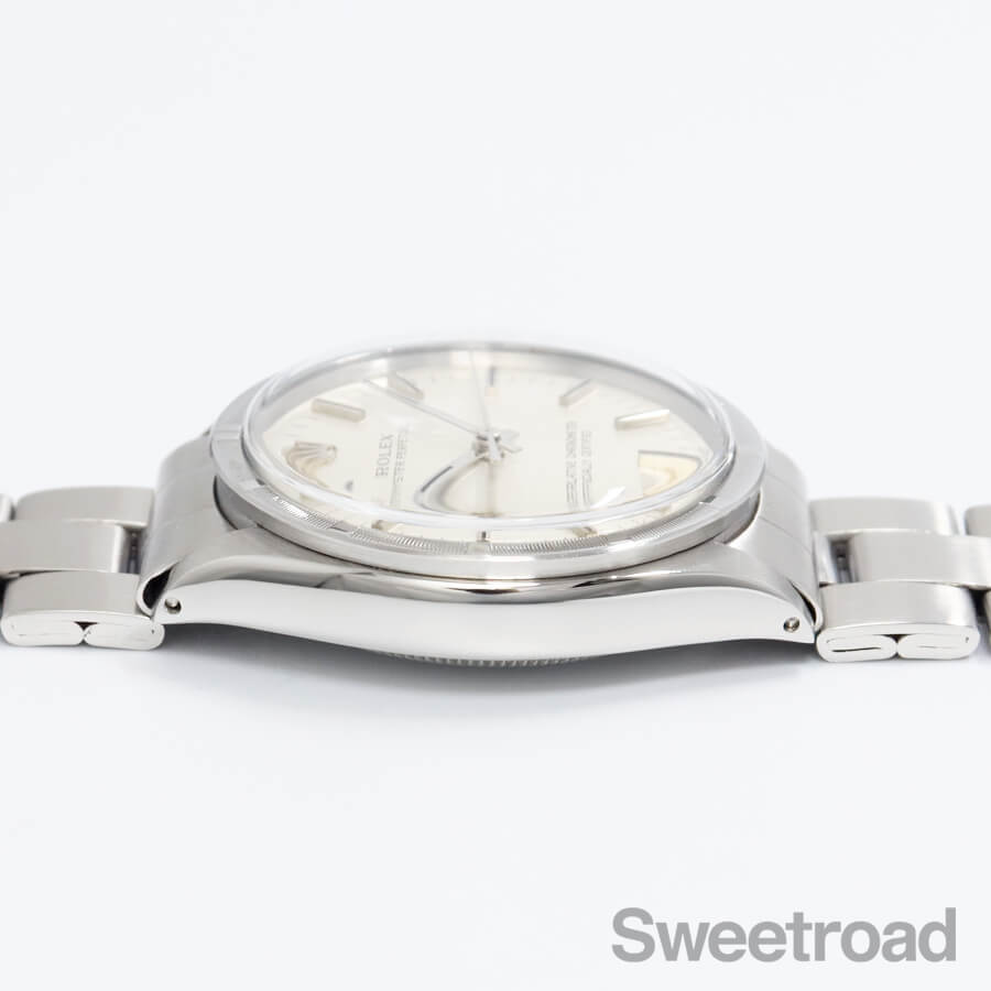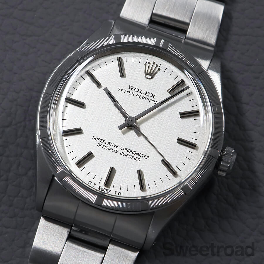 刻みの入ったエンジンターンドベゼルに、美しいヘアライン仕上げのダイヤルが配された、ロレックスのノンデイト自動巻モデル「Ref.1007」。 スタンダードモデルながら存在感が強く、どこかスポーティな印象を受けます。 文字盤は特筆すべき傷みはなく、綺麗な顔立ちが目を惹きます。 また、6時位置に表記された「シグマ/σ」マークには、文字盤に金を使用していることを表しており、シグマダイヤルと呼ばれる珍しい個体でもあります。 ケースとベゼルには僅かな痩せや丸みはございますが、全体的に傷の少ない綺麗なコンディションを維持しています。 ベルトはロレックス純正の巻きブレス(フルコマ)が装着されており、ケースと同年式の貴重な組み合わせです。