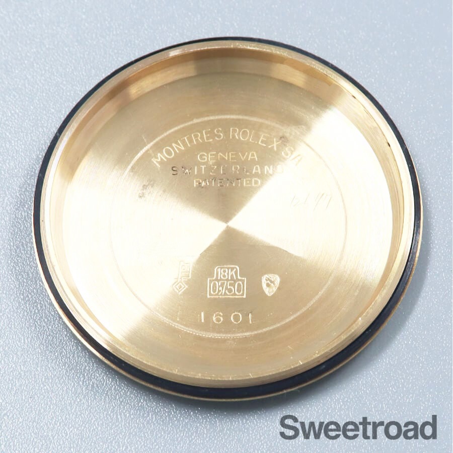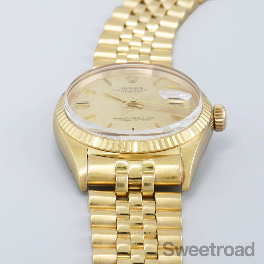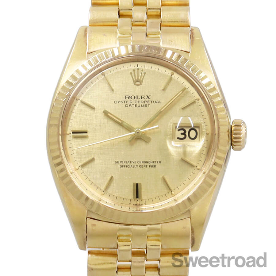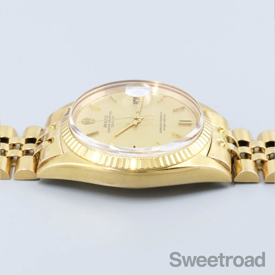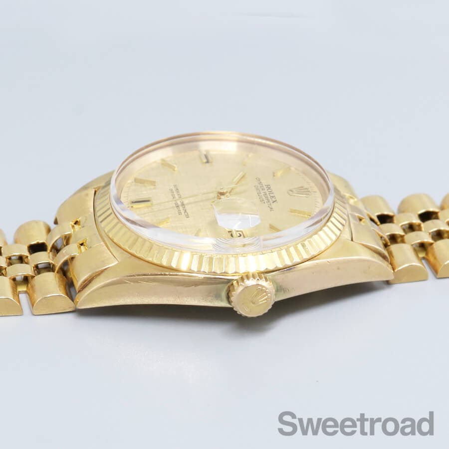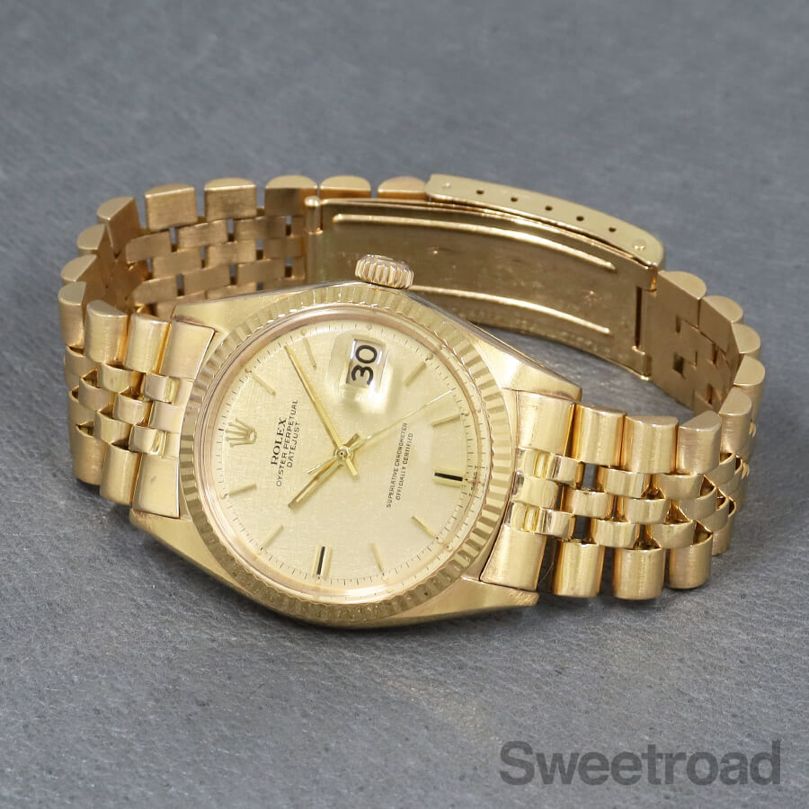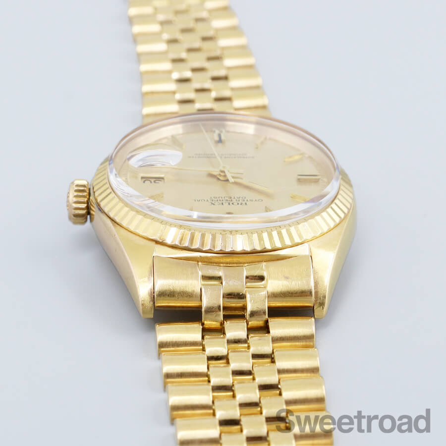 ケースやブレスレットに18金無垢が使用された、デイトジャスト/Ref.1601/8が入荷しました。 シャンパンゴールドのモザイクダイヤルに同系色のカレンダーが採用された高級機種ならではの顔立ちが魅力的です。 6時、9時位置に特徴的なカッティングが施されたインデックスがあり、それを強調するようにシャープなインデックスが配されています。 外装には小傷や金焼けなどがございますが、過度な打痕やケース痩せは見られず、ベゼルの刻みもしっかりと残っています。 ベルトは、希少性の高い18金無垢仕様のロレックス純正ジュビリーブレスが装着されており、 バックルにて約2.0cmの調整が可能です。 それより短い長さをご希望の方はご相談ください。 当店にてOH(分解掃除)を行っております。