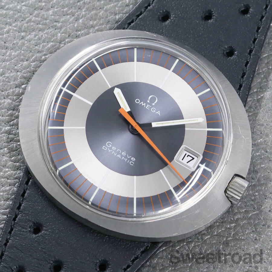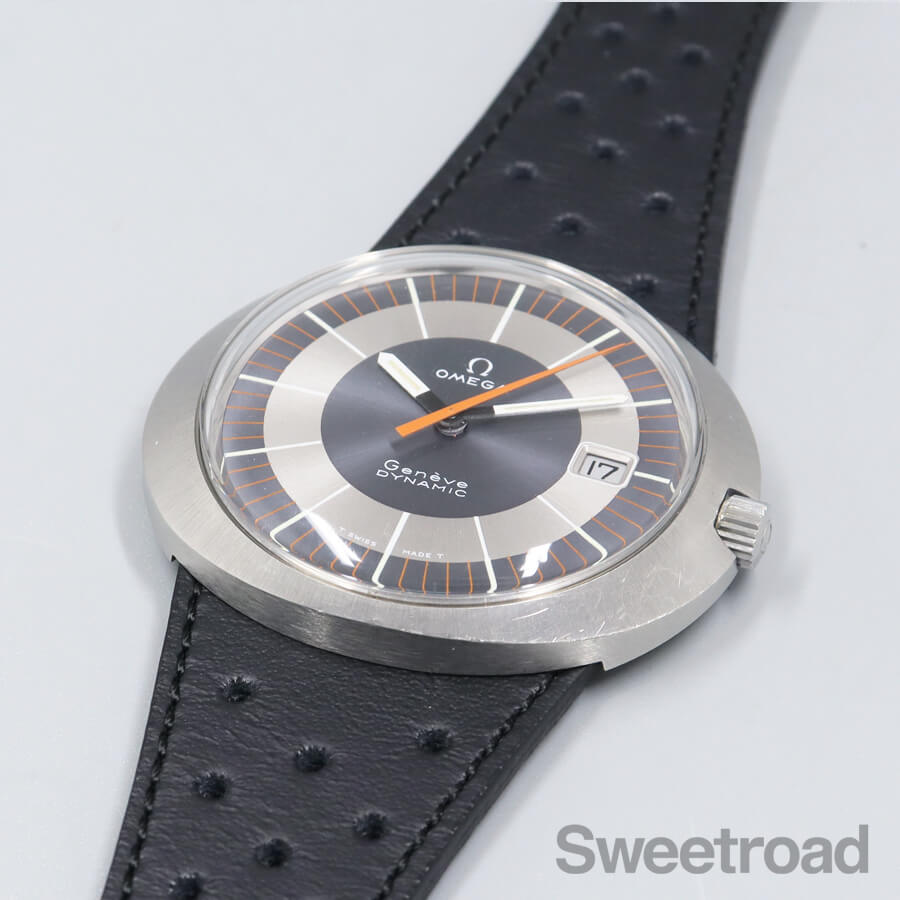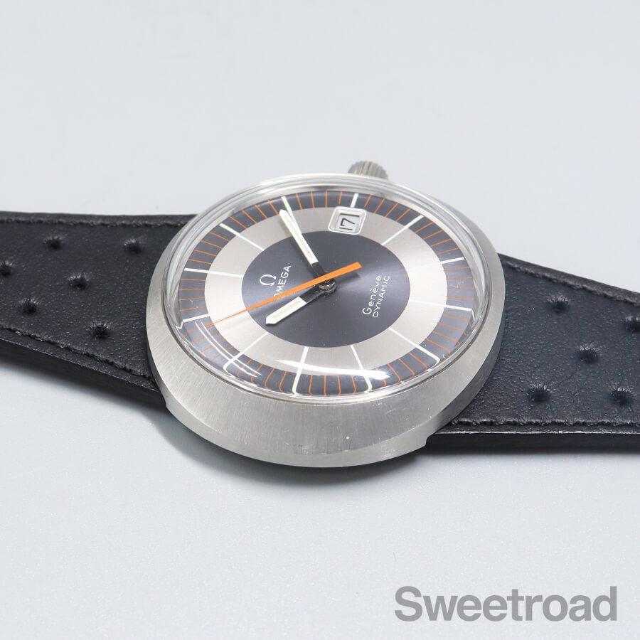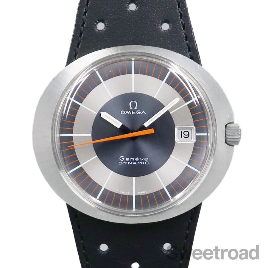 バリエーション豊かなダイヤルデザインで人気を博した「ジュネーブ・ダイナミック」。 オーバルケースやツートンダイヤルなど、当時流行したスペースエイジデザインが採用されており、ヴィンテージオメガらしい個体です。 メタリックなシルバーとグレーの文字盤に、オレンジの秒針が配された特徴的な顔立ちをしています。 針夜光に若干の経年は見受けられるものの、その他は特筆すべき傷みのない綺麗な状態を保っています。 ケースは裏蓋一体型の防水性を高めたワンピース構造になっており、裏のスクリューリングを外すとケース本体とブレス(台座)が分かれる他に類を見ない独特な設計を採用しています。 外装には若干の小傷や線傷がございますが、過度なケース痩せや打痕などは見られません。 ムーブメントは実用的な日付のクイックチェンジ機能を搭載した手巻き「Cal.613」を搭載しています。 ベルトはジュネーブダイナミック専用のレザーベルト(スイートロードオリジナル品)に、ハシゴ型の貴重なオメガ純正尾錠を装着しています。 当店にてOH(分解掃除)を行っております。