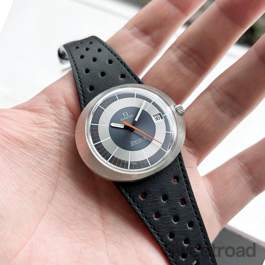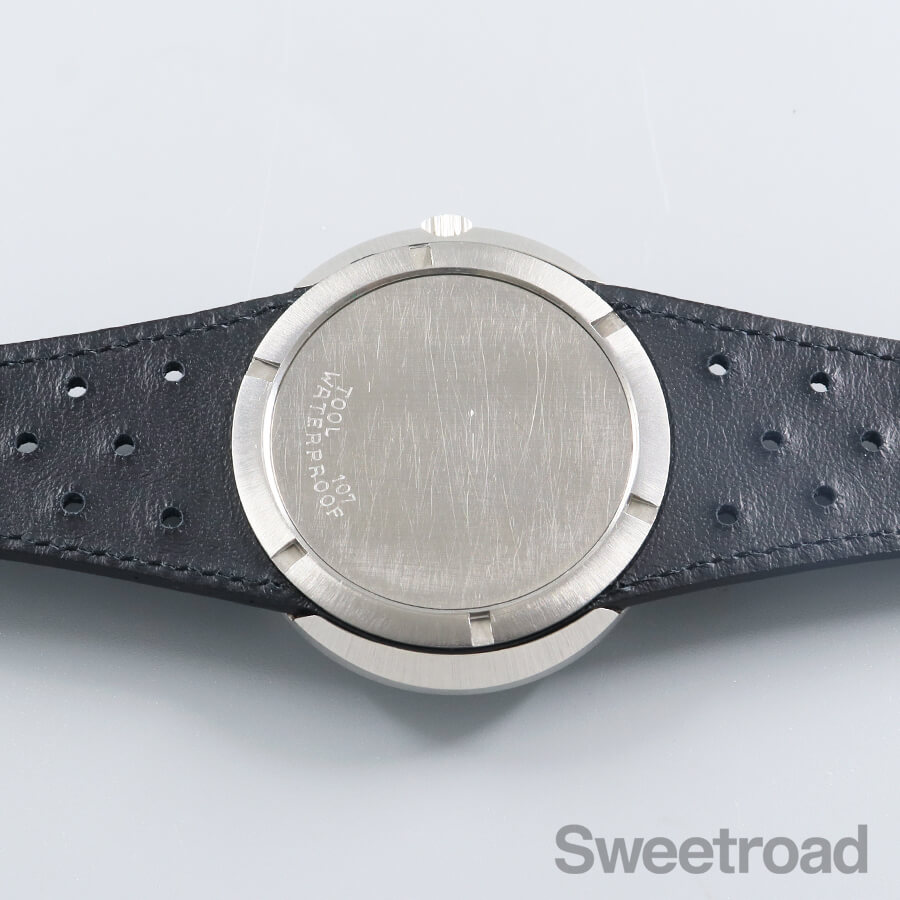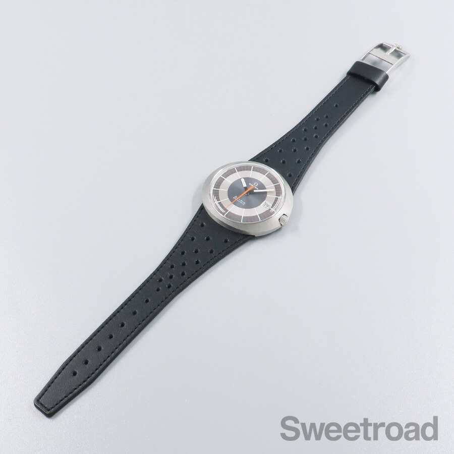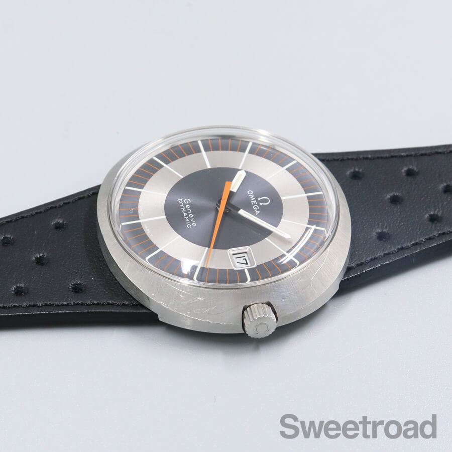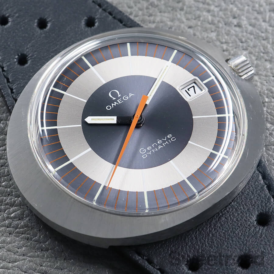 バリエーション豊かなダイヤルデザインで人気を博した「ジュネーブ・ダイナミック」。 オーバルケースやツートンダイヤルなど、当時流行したスペースエイジデザインが採用されており、ヴィンテージオメガらしい個体です。 メタリックなシルバーとグレーの文字盤に、オレンジの秒針が配された特徴的な顔立ちをしています。 針夜光に若干の経年は見受けられるものの、その他は特筆すべき傷みのない綺麗な状態を保っています。 ケースは裏蓋一体型の防水性を高めたワンピース構造になっており、裏のスクリューリングを外すとケース本体とブレス(台座)が分かれる他に類を見ない独特な設計を採用しています。 外装には若干の小傷や線傷がございますが、過度なケース痩せや打痕などは見られません。 ムーブメントは実用的な日付のクイックチェンジ機能を搭載した手巻き「Cal.613」を搭載しています。 ベルトはジュネーブダイナミック専用のレザーベルト(スイートロードオリジナル品)に、ハシゴ型の貴重なオメガ純正尾錠を装着しています。 当店にてOH(分解掃除)を行っております。