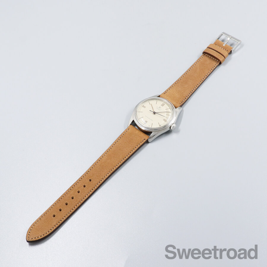ピンクゴールドの針やローマンインデックスが配されたヴィンテージらしい顔立ちが目を惹く個体です。