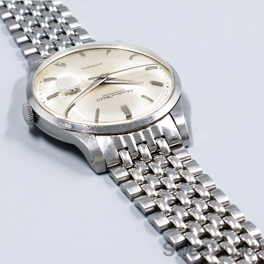 筆記体ロゴが目を惹く、IWCのヴィンテージモデルが入荷しました。 ペラトン方式の自動巻ムーブ「Cal.8531」を搭載しており、デイトが内側に寄っていることから「寄り目デイト」という愛称で高い人気を誇っています。 上品なサンレイ仕上げのシルバーダイヤルは、ほんのりと飴色にエイジングした、ヴィンテージらしい顔立ち。 僅かな経年が見られる程度の綺麗な状態を保っています。 外装には小傷や細かな打ち傷があるものの、過度なダメージは見られず、ミドルケースのヘラアインは残っています。 ベルトはゲイフレアー社製のIWC純正ライスブレスが装着されています。 当店にてOH(分解掃除)を行っております。
