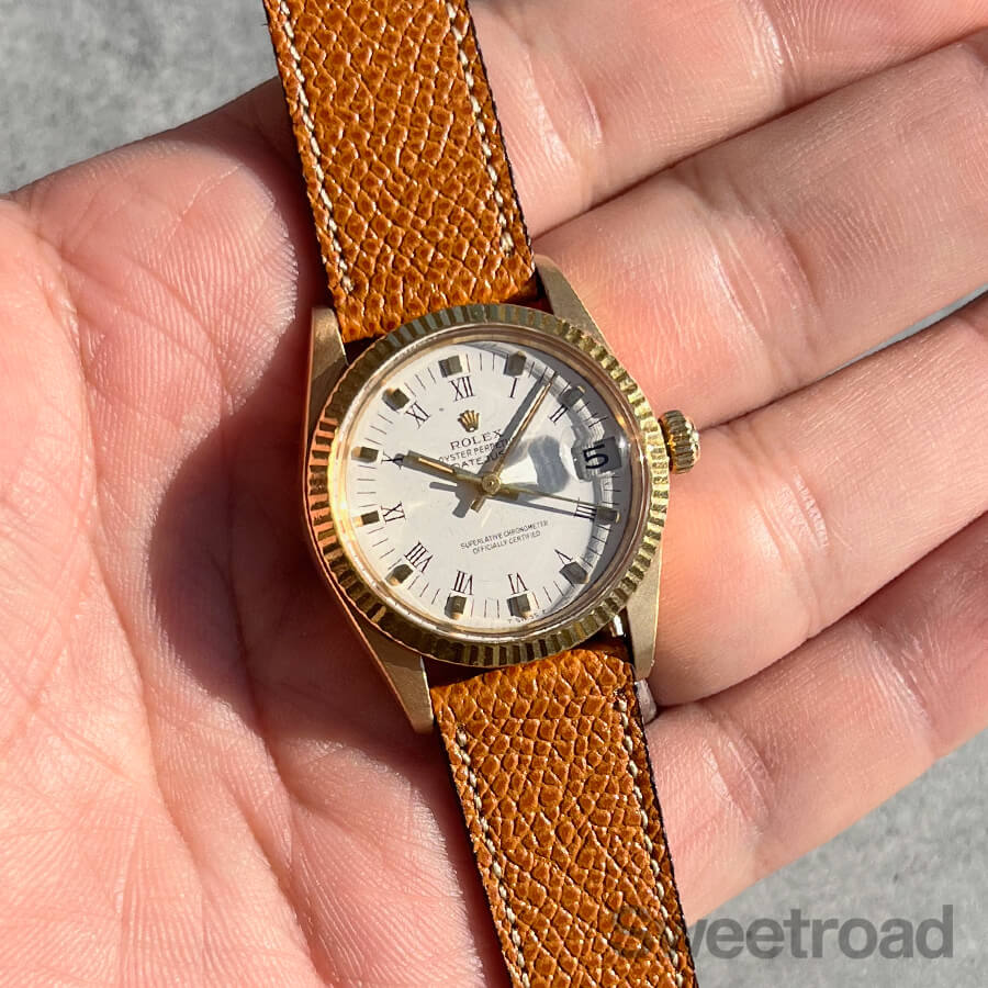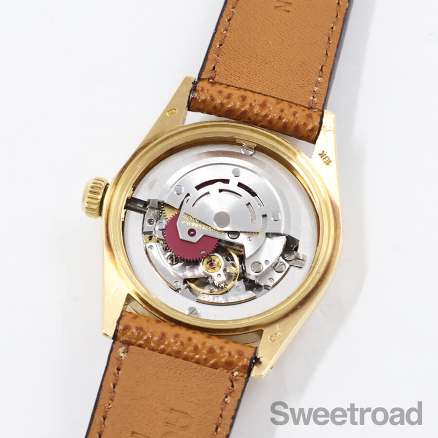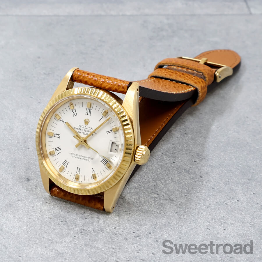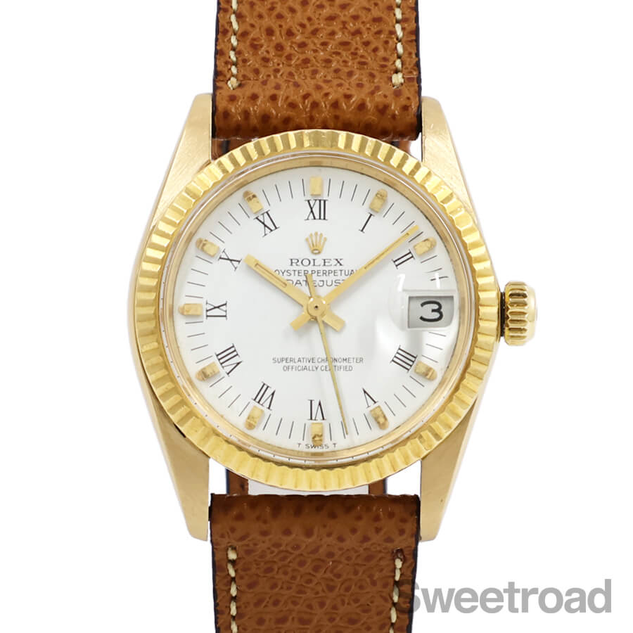 ロレックスの中でも流通数の少ないボーイズサイズモデル「デイトジャスト/Ref.6827」が入荷しました。 本商品は、18Kイエローゴールド仕様のケースが採用された高級感のある個体で、デイトジャストらしいフルーテッドベゼルに、落ち着いた雰囲気のマットホワイトダイヤル、ローマンインデックスなど、小ぶりなサイズ感と相まって非常に上品な雰囲気に仕上がっています。 針やインデックスにはわずかに経年が現れていますが、文字盤自体に目立つような傷みはございません。 外装には細かな小傷こそあるものの、程度の良い個体に見られる金灼けや、裏蓋に当時の保護シールが残っており、大変良好なコンディションを保っています。ベルトはアキュレイトフォルムのレザーベルトを装着しています。当店にてOH(分解掃除)を行っております。