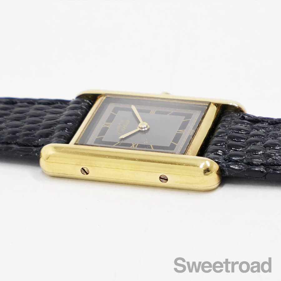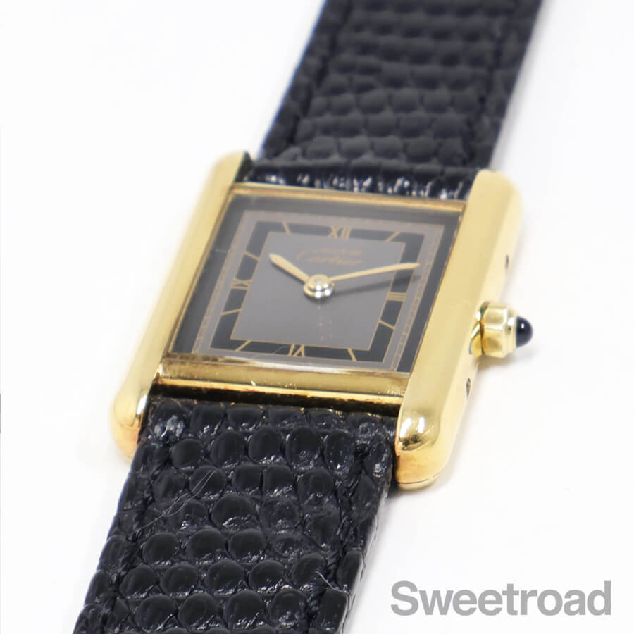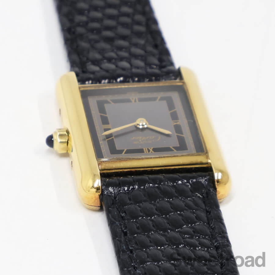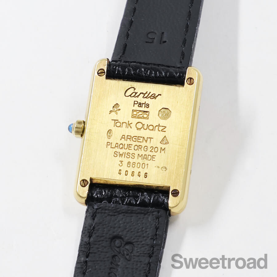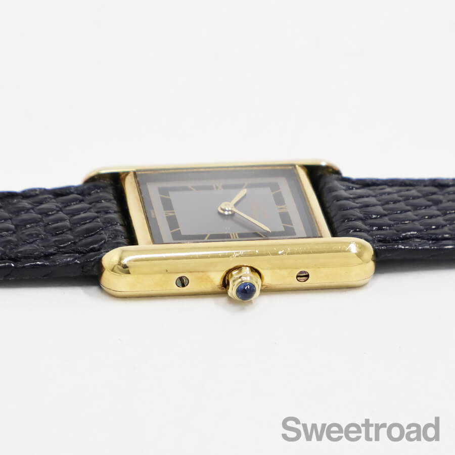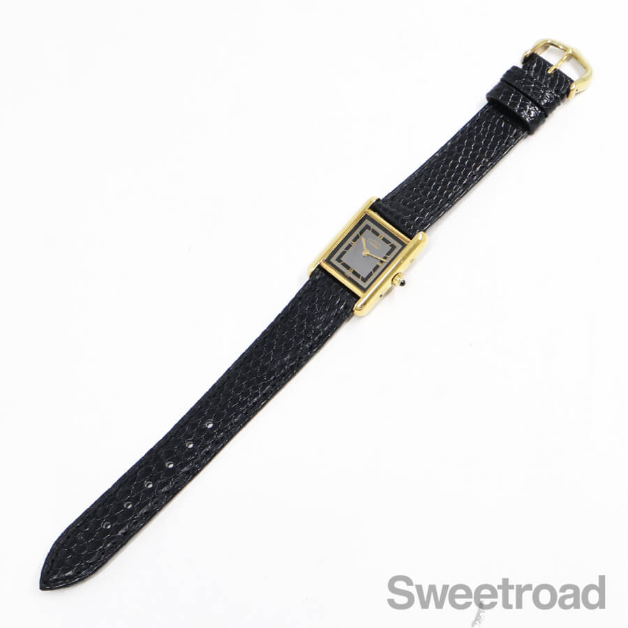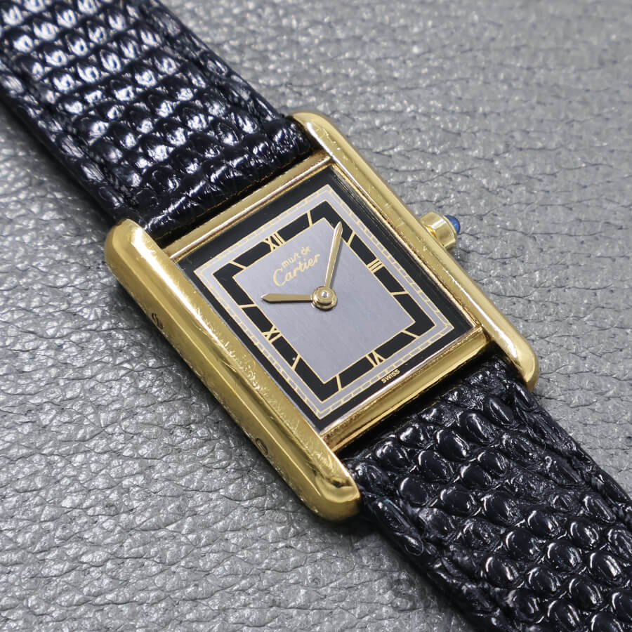 カルティエの象徴として人気を誇る「マストタンク」。 本商品は、小ぶりなSMサイズのモデルで、上品なグレーツートンダイヤルが目を惹く希少性の高い逸品です。 ケースはスターリングシルバー(銀無垢)に20ミクロンもの金を貼り付けて作られた、カルティエを代表する「ヴェルメイユケース」を採用されています。 若干の小傷こそございますが、雰囲気を損なうような過度なダメージは見られず、ケースバックの刻印もはっきりとしています。 カシス社のリザードレザーベルトにカルティエ純正尾錠を取り付けています。 電池交換を行っていますので、すぐにご使用いただけます。