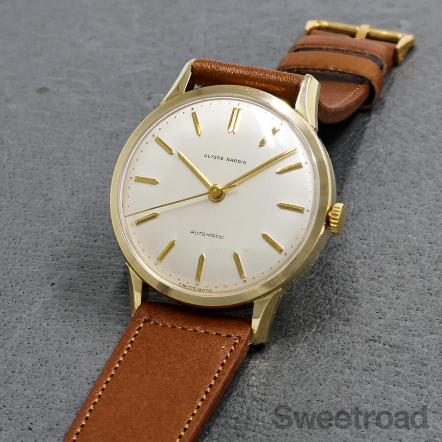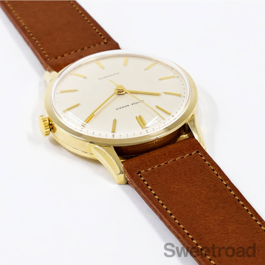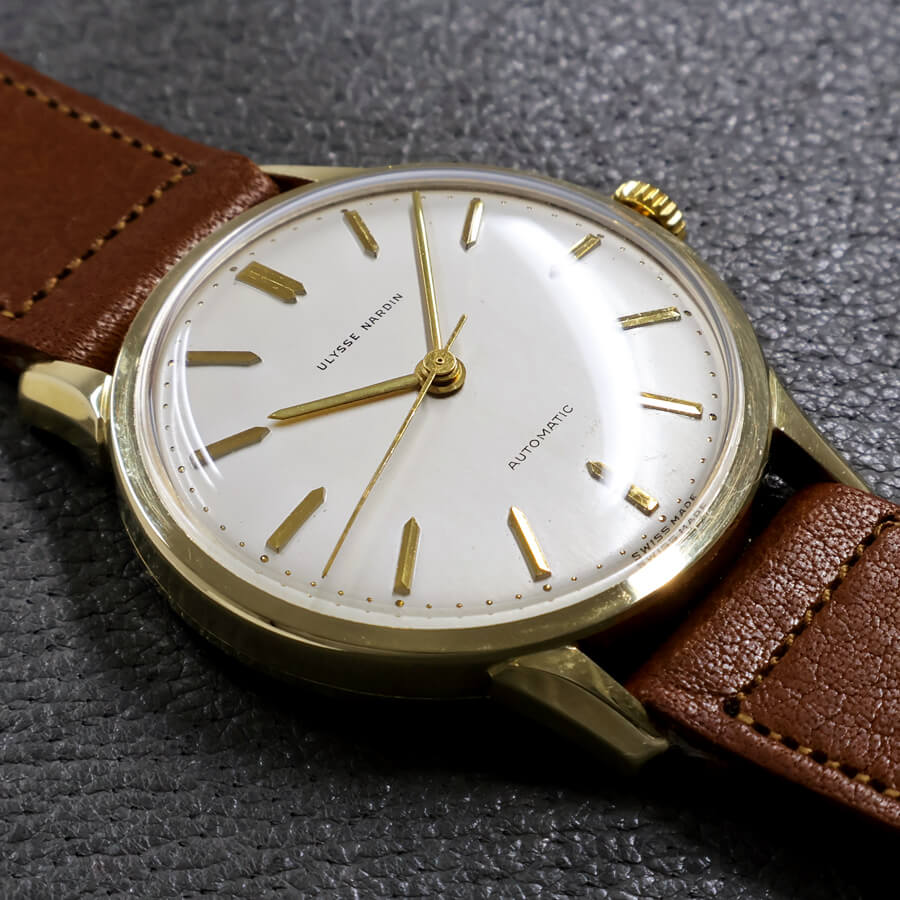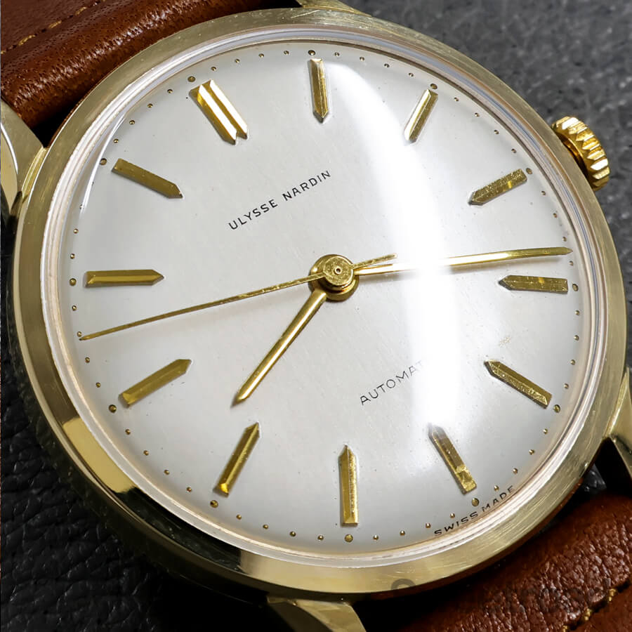 船舶用クロノメーターの分野でほぼ独占状態になるほど成功し、50カ国の海軍に納入された歴史を持つ老舗時計メーカー「ユリス・ナルダン」。 本商品は、18KYGケースが採用された高級機仕様のヴィンテージモデルです。 上品なヘアライン仕上げのオリジナルダイヤルに、ゴールドの針とインデックスが配された高級感漂う顔立ち。 5時位置インデックス付近に僅かな凹凸がございますが、肉眼でも分かりずらい軽微なものですので、着用時には気にならないと思います。 外装には金無垢特有の小傷や細かな打ち傷こそございますが、目立つようなダメージは見られず、エッジやボリューム感がしっかりと残った良好なコンディションです。ベルトはアキュレイトフォルムのレザーベルトを装着しています。 当店にてOH(分解掃除)を行っております。