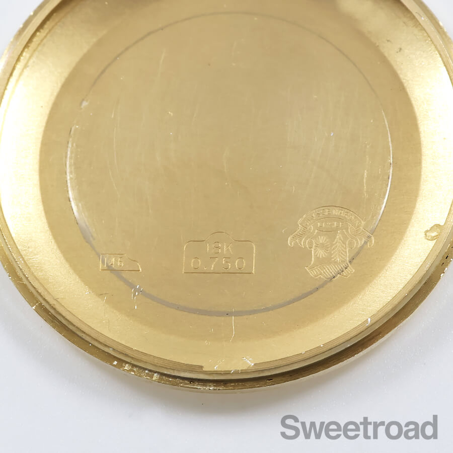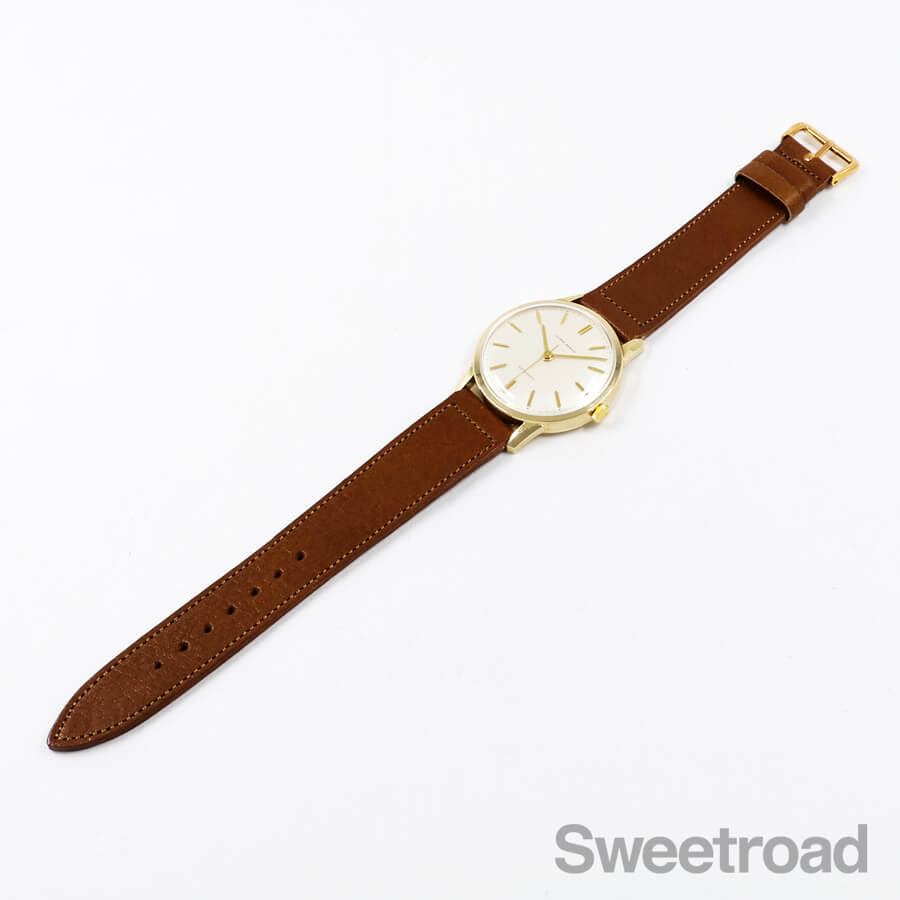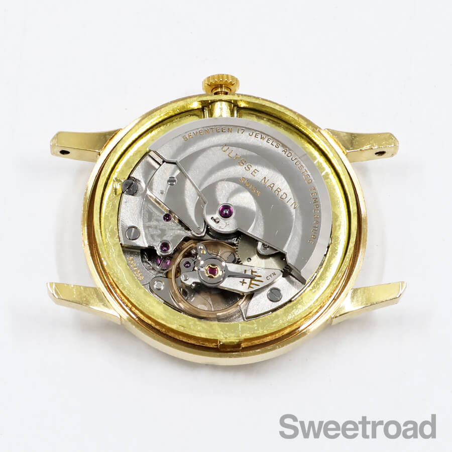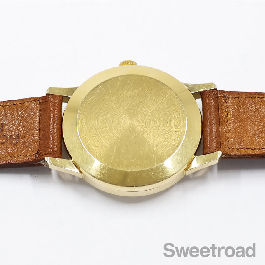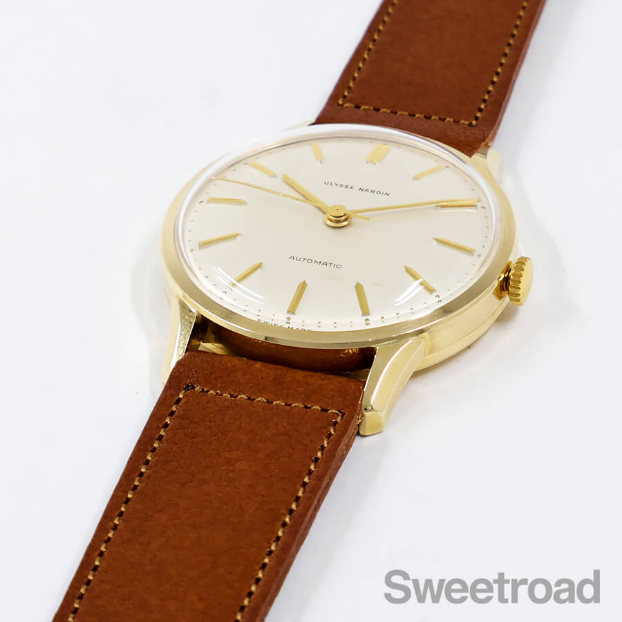 船舶用クロノメーターの分野でほぼ独占状態になるほど成功し、50カ国の海軍に納入された歴史を持つ老舗時計メーカー「ユリス・ナルダン」。 本商品は、18KYGケースが採用された高級機仕様のヴィンテージモデルです。 上品なヘアライン仕上げのオリジナルダイヤルに、ゴールドの針とインデックスが配された高級感漂う顔立ち。 5時位置インデックス付近に僅かな凹凸がございますが、肉眼でも分かりずらい軽微なものですので、着用時には気にならないと思います。 外装には金無垢特有の小傷や細かな打ち傷こそございますが、目立つようなダメージは見られず、エッジやボリューム感がしっかりと残った良好なコンディションです。ベルトはアキュレイトフォルムのレザーベルトを装着しています。 当店にてOH(分解掃除)を行っております。