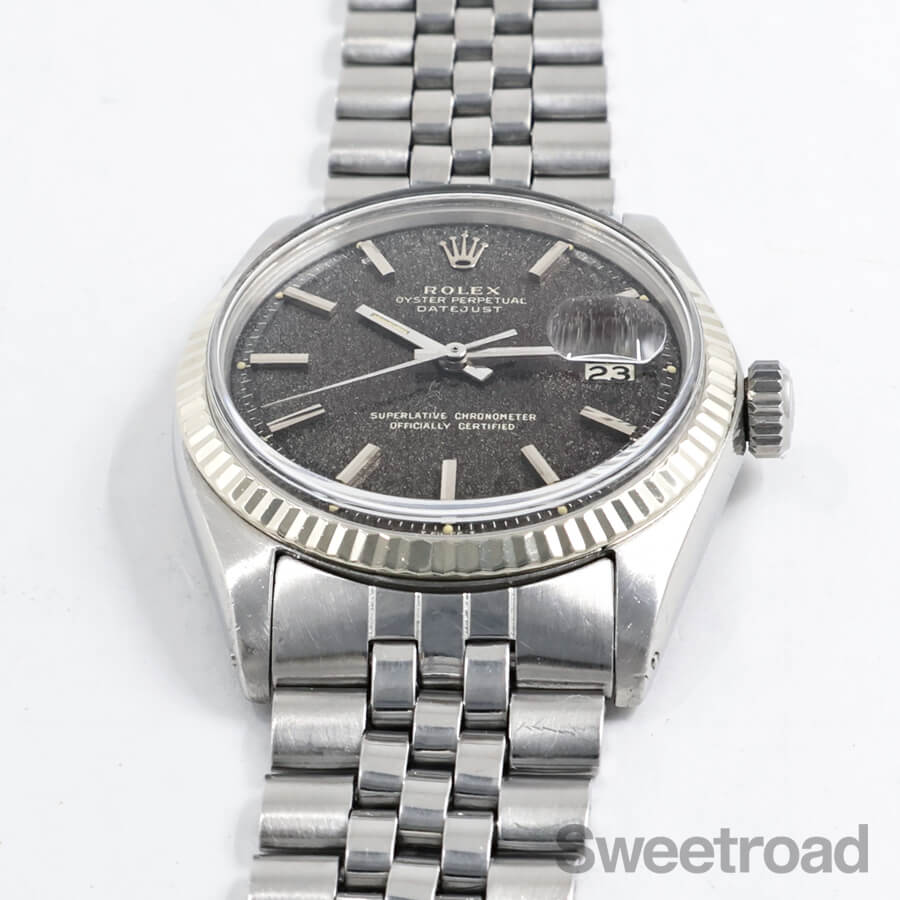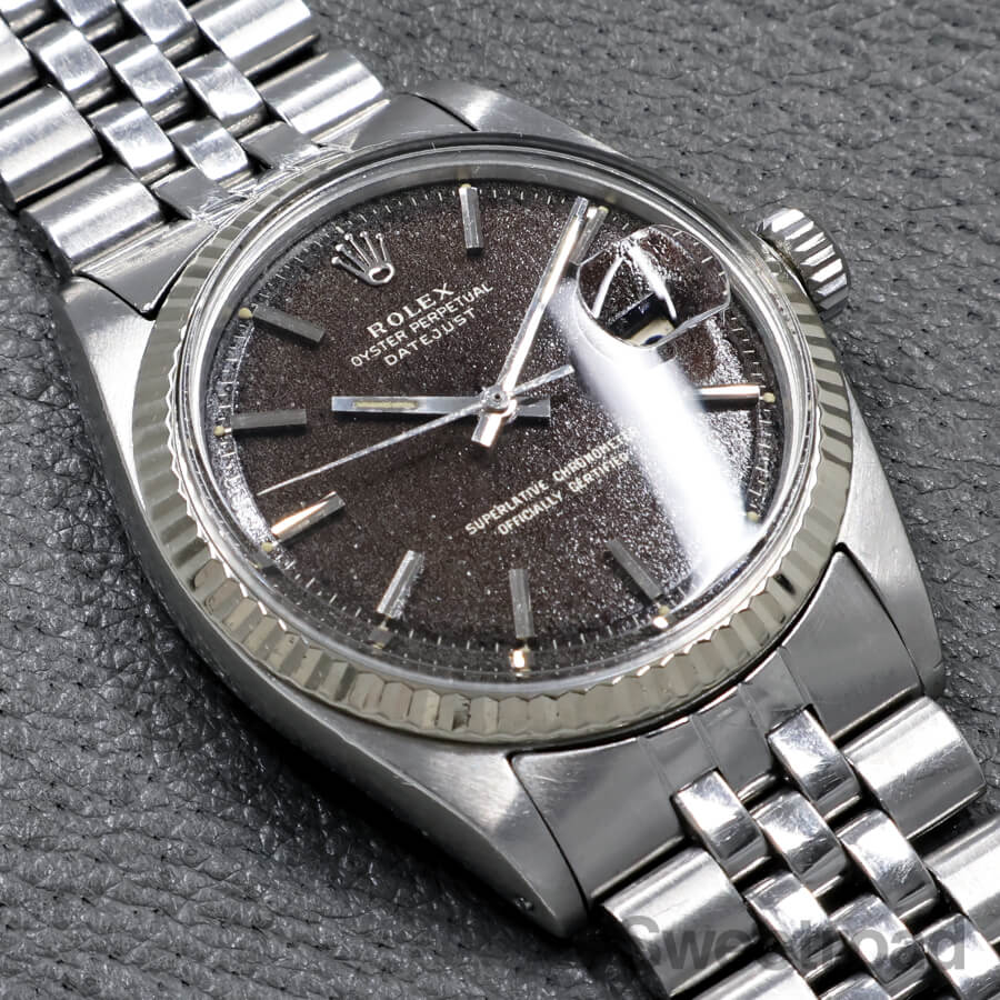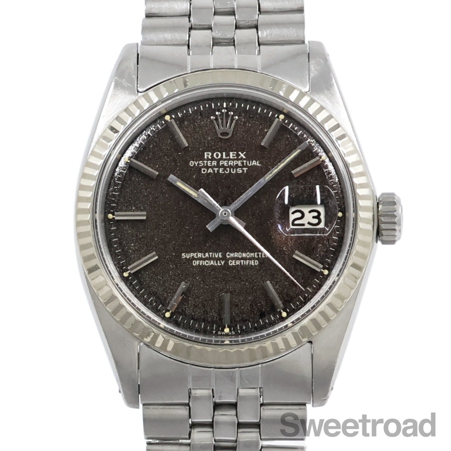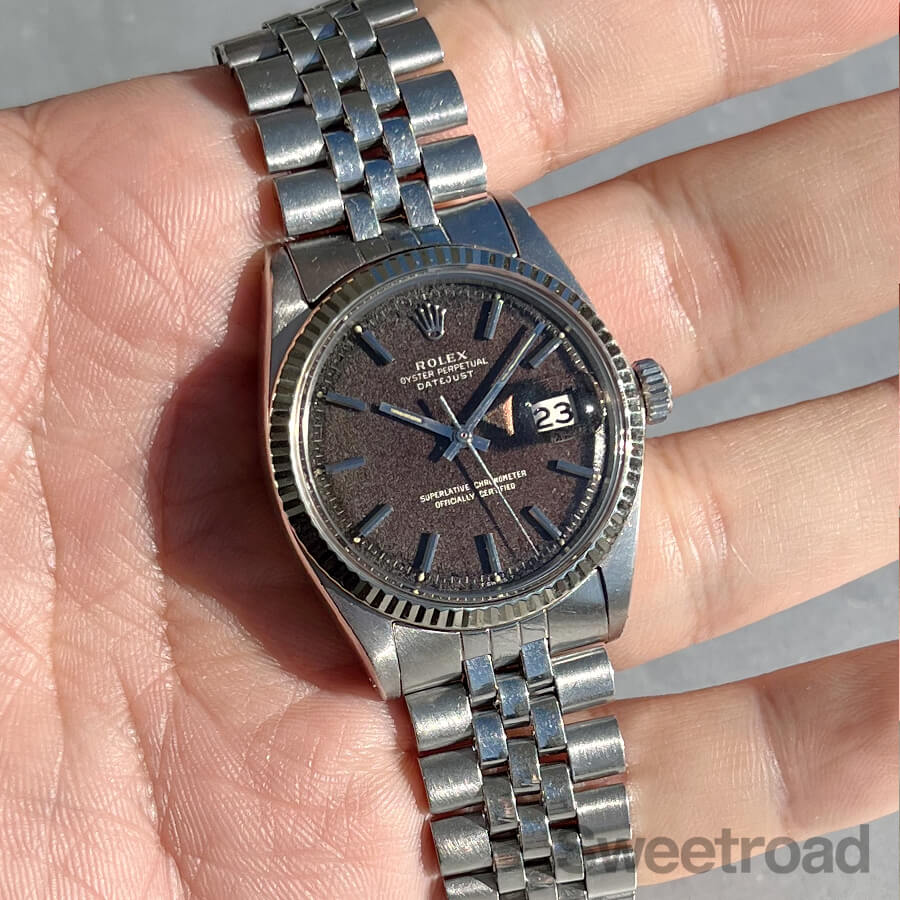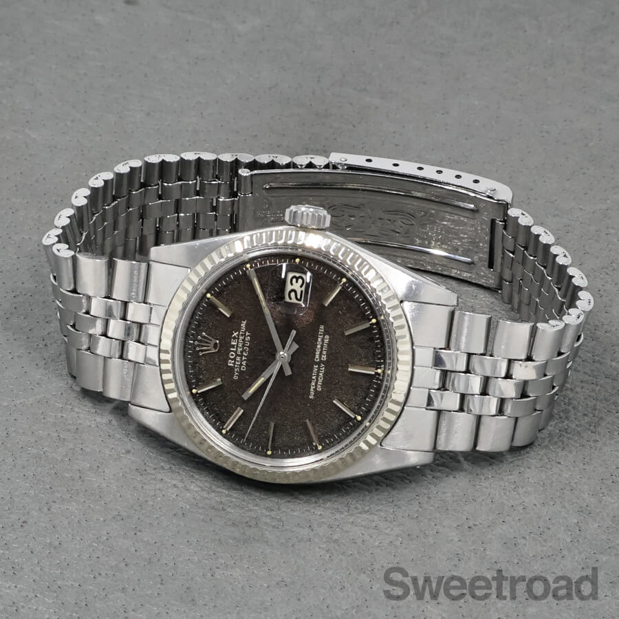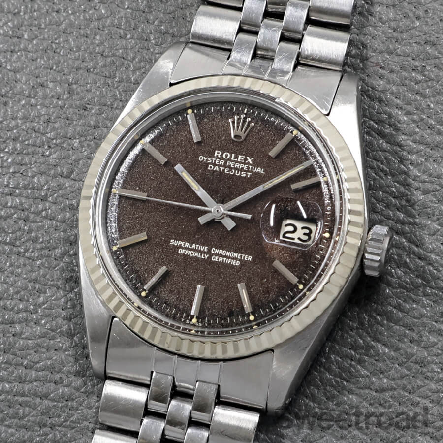 オリジナルのブラックミラーダイヤルが経年によりブラウンチェンジをした、非常に珍しい「ロレックス・デイトジャスト/Ref.1601」が入荷しました。 南国の強い日差しに当てられ続けたような褪色から「トロピカルダイヤル」とも呼ばれています。 特徴のあるグロッシーな艶感も残っており、ここまで雰囲気のあるエイジングは今後出てこないかもしれません。 外装には経年による小傷や細かな打傷が見受けられるますが、オイスターケースのボリューム感やベゼルの刻みはしっかりと残っています。 鳥足やデベソなどと呼ばれる王冠が飛び出たバックルが付いた、貴重なロレックス純正のジュビリーブレスを装着しています。 当店にてOH(分解掃除)を行っております。