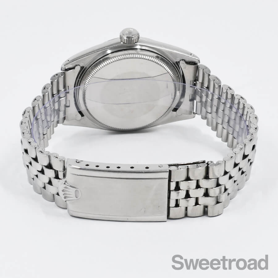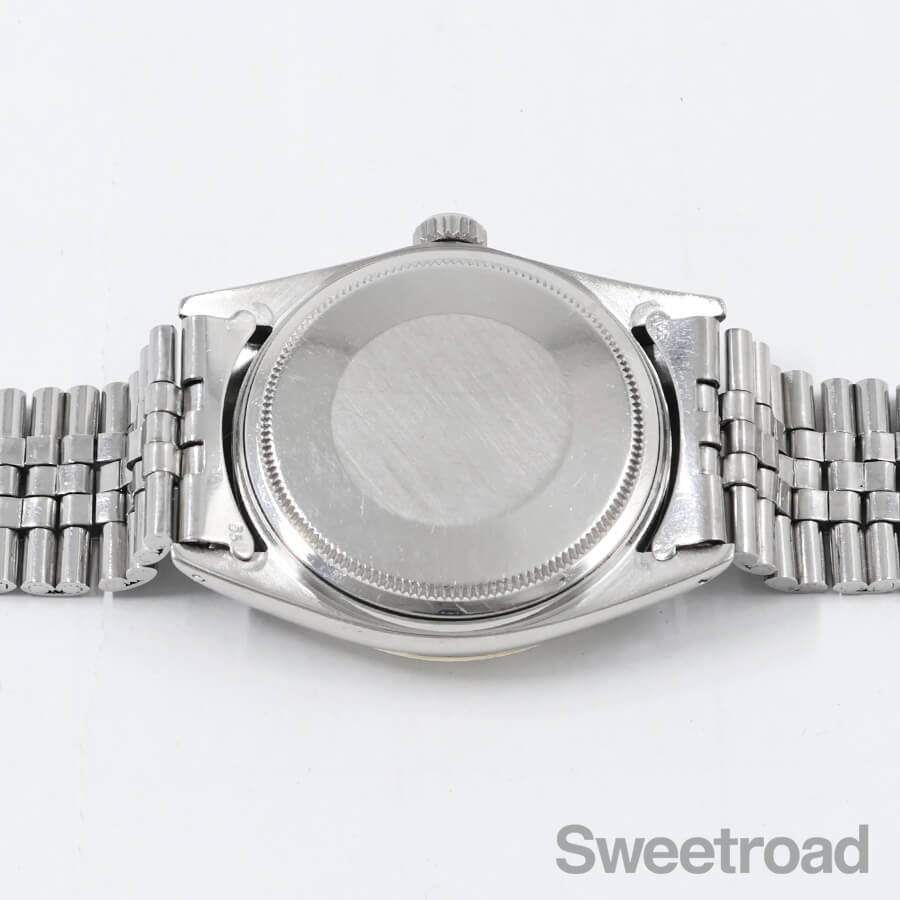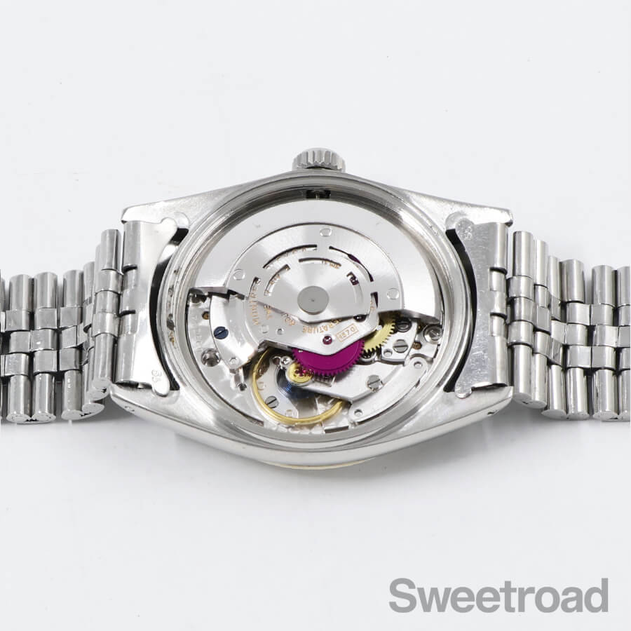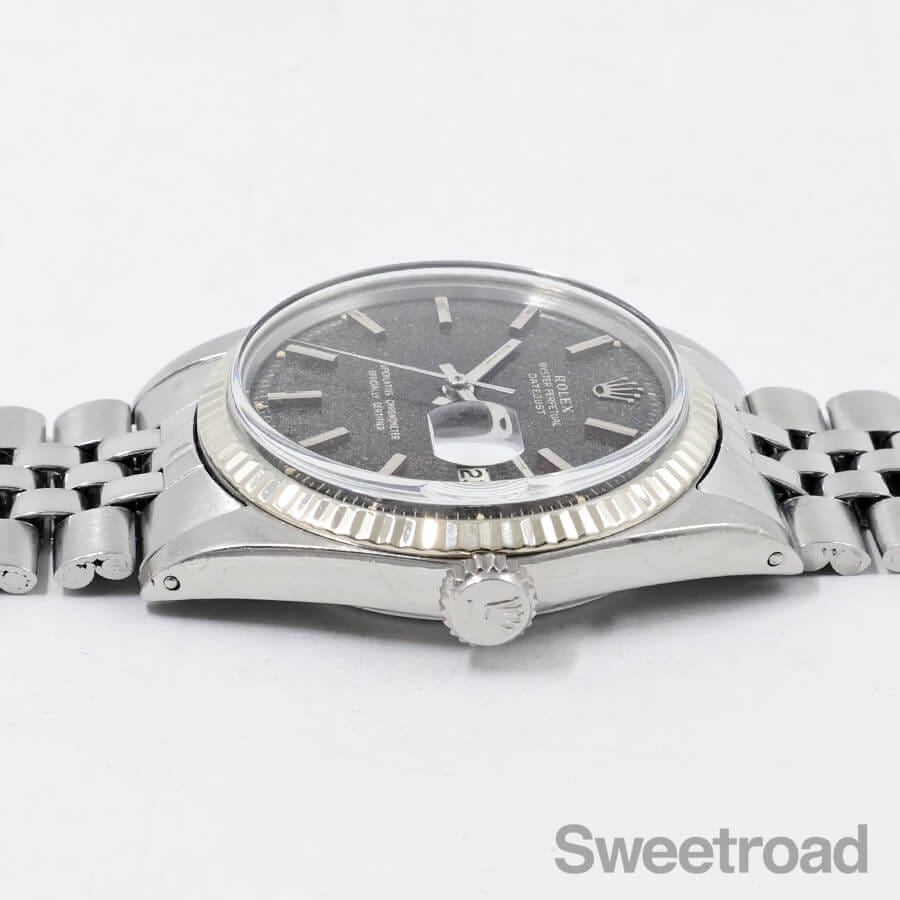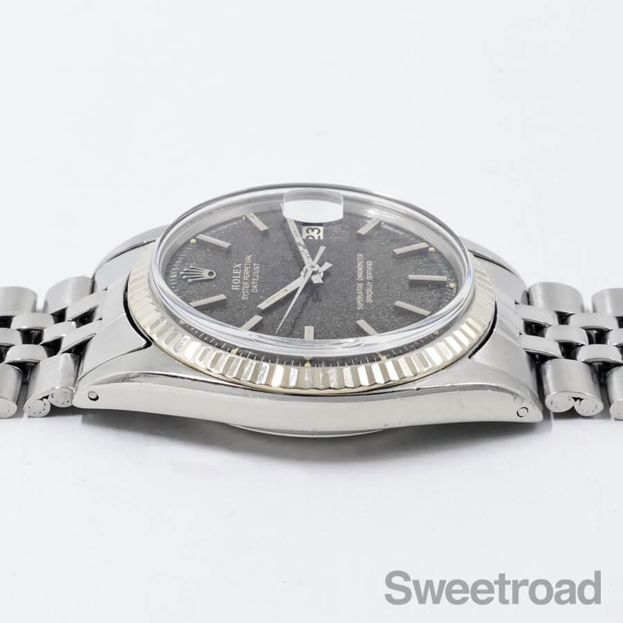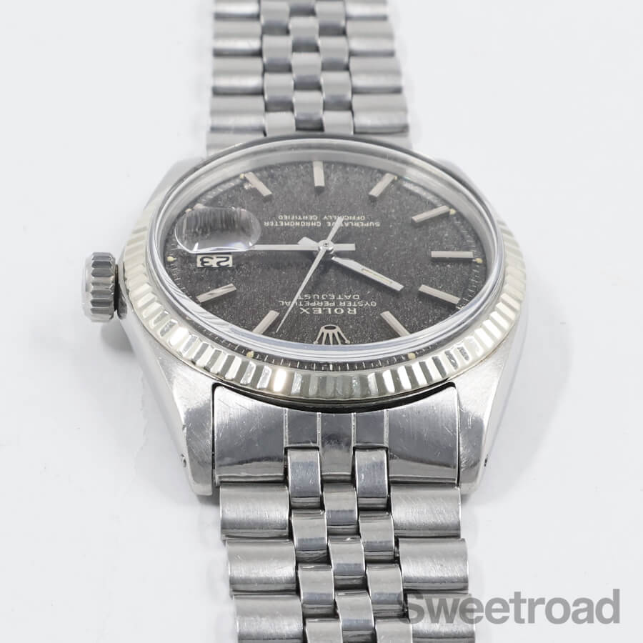 オリジナルのブラックミラーダイヤルが経年によりブラウンチェンジをした、非常に珍しい「ロレックス・デイトジャスト/Ref.1601」が入荷しました。 南国の強い日差しに当てられ続けたような褪色から「トロピカルダイヤル」とも呼ばれています。 特徴のあるグロッシーな艶感も残っており、ここまで雰囲気のあるエイジングは今後出てこないかもしれません。 外装には経年による小傷や細かな打傷が見受けられるますが、オイスターケースのボリューム感やベゼルの刻みはしっかりと残っています。 鳥足やデベソなどと呼ばれる王冠が飛び出たバックルが付いた、貴重なロレックス純正のジュビリーブレスを装着しています。 当店にてOH(分解掃除)を行っております。