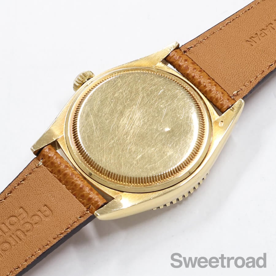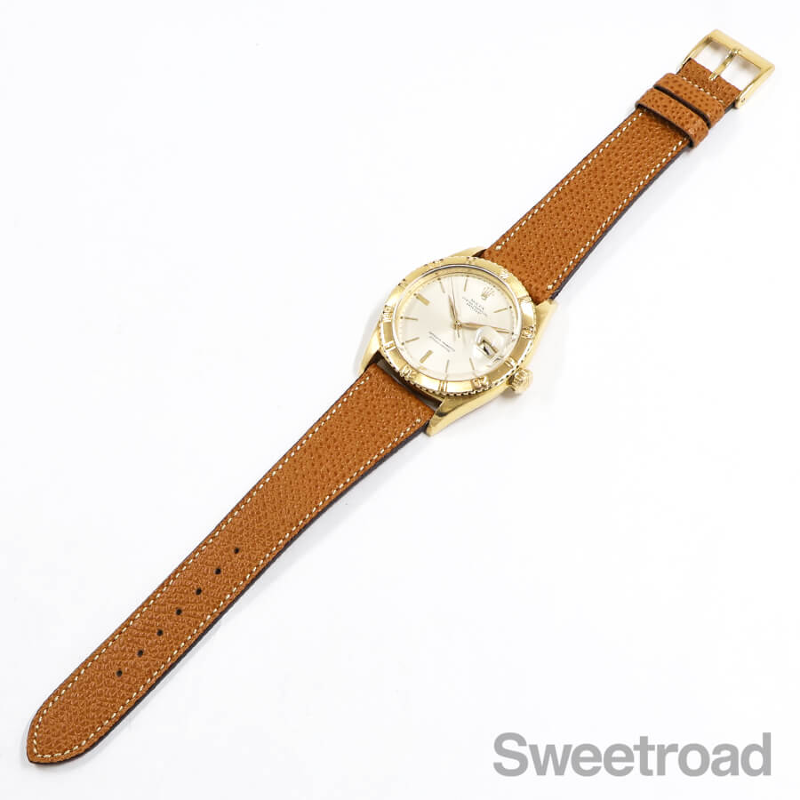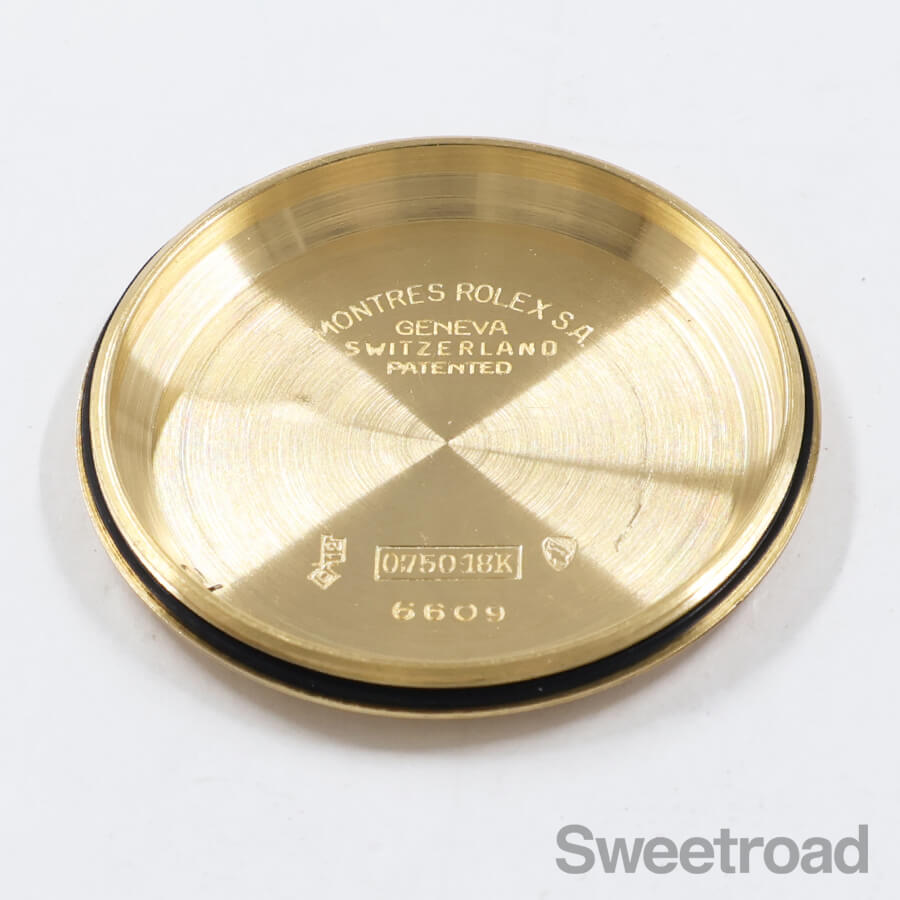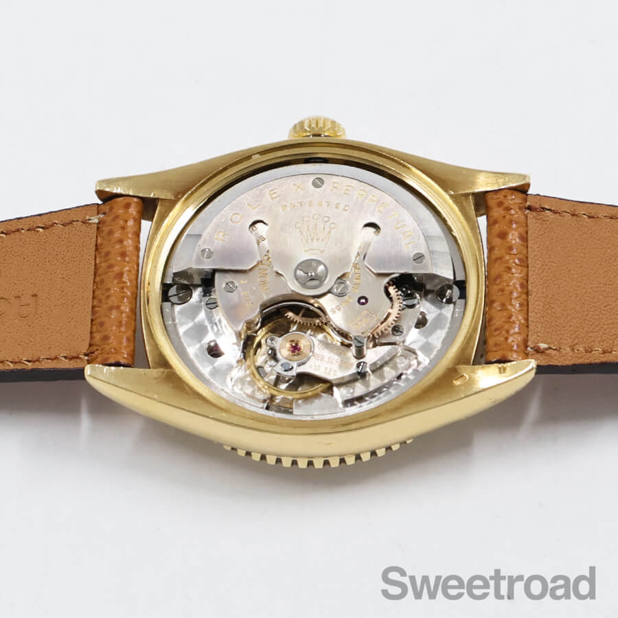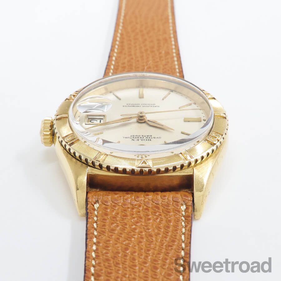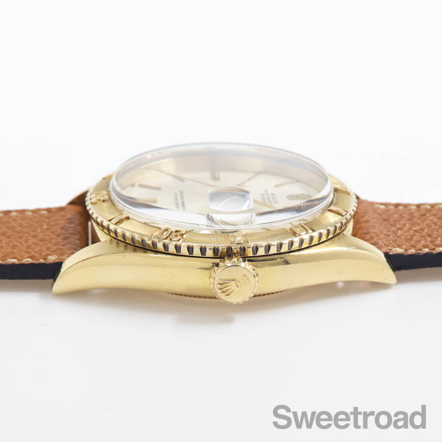 希少性の高いロレックス・デイトジャスト・サンダーバードの2ndモデル「Ref.6609」が入荷しました。 本商品は、ミドルケースやベゼルに18KYGが使用された最高級機種です。 文字盤には程よい焼けや点々としたエイジングが現れていますが、針や外周の夜光に崩れは見られず、当時のままの貴重な状態を維持しています。 ケースには若干の丸みや細かな打傷があり、裏蓋の一部に凹みがございますが、オイスターケースのボリューム感はしっかりと残っており、ベゼルの刻みにもダレている箇所の無い良好な状態を保っています。 ムーブメントは、世界初の両方向巻上げ式ムーブであるCal.1030と基本構造を同じくした「Cal.1066」を搭載しています。 Cal.1030が緩急針のみで精度の調整を行うのに対し、Cal.1066では緩急針とミーンタイムスクリューという2つの調整機構を備えているのが特徴です。 ベルトはアキュレイトフォルムのレザーベルトを装着しています。 当店にてOH(分解掃除)を行っております。