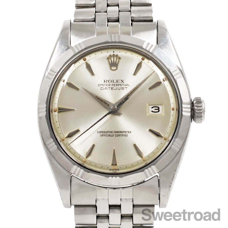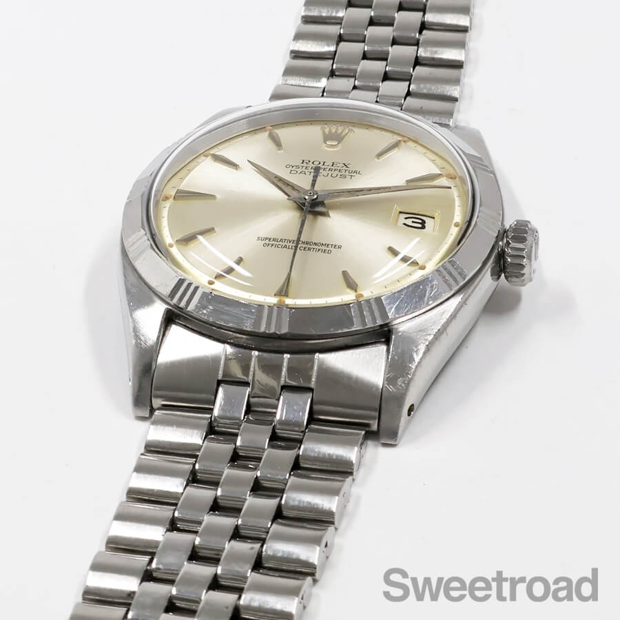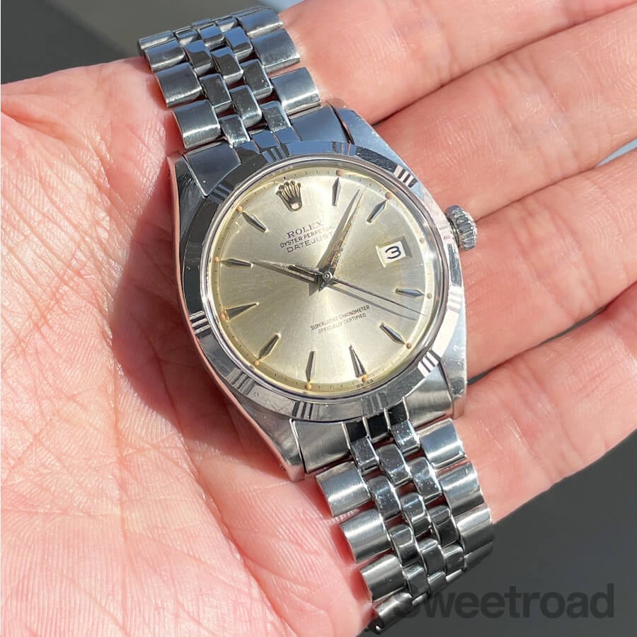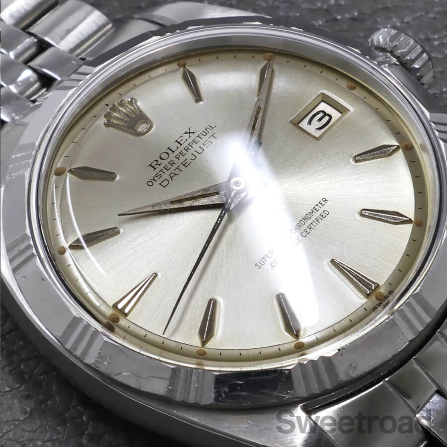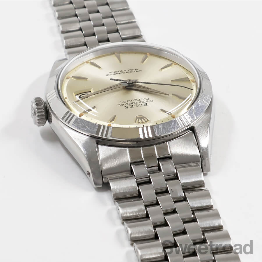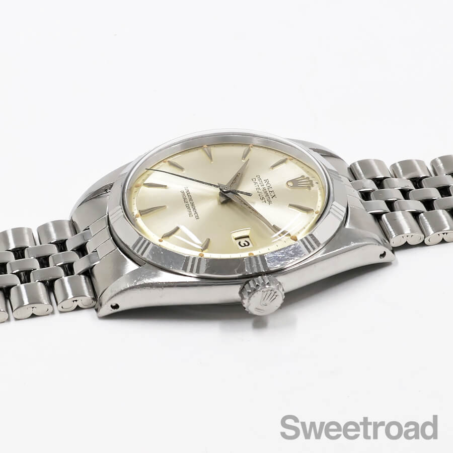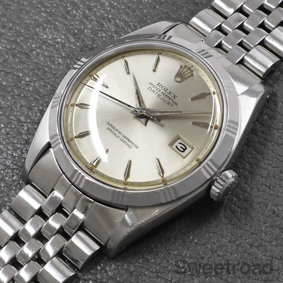 艶感のあるサンレイ仕上げのシルバーダイヤルは、ドーフィン針やクサビインデックスが配され、一段下がった外周などヴィンテージデイトジャストの魅力が詰まった逸品。