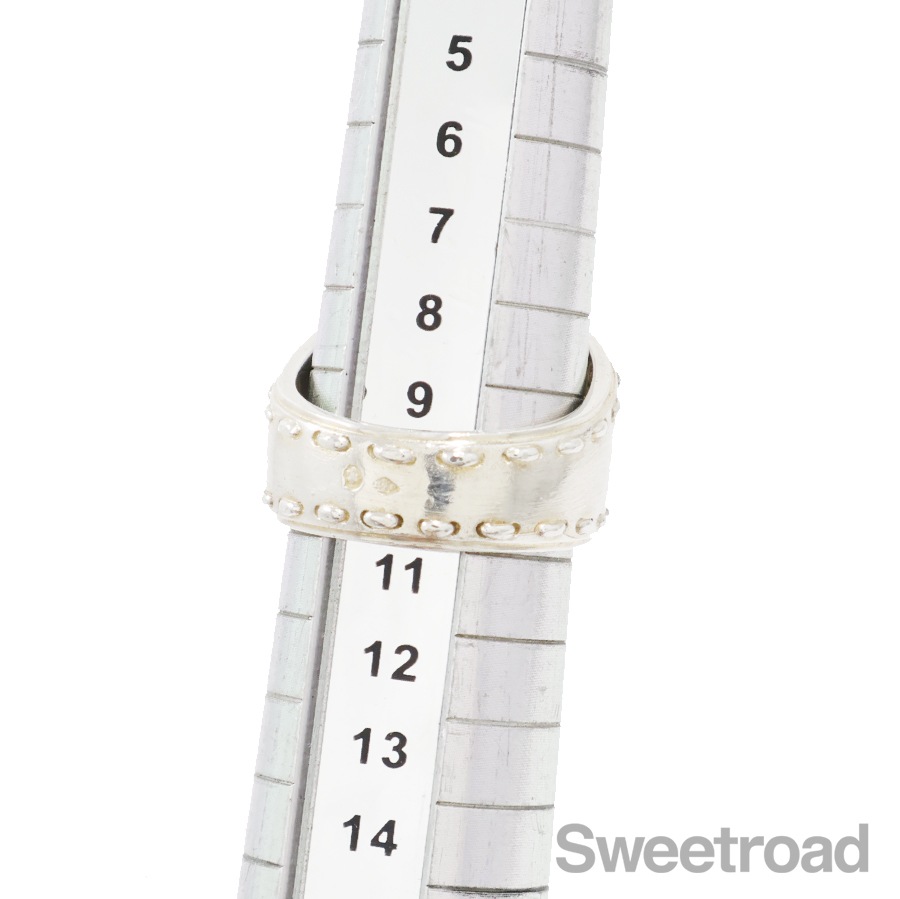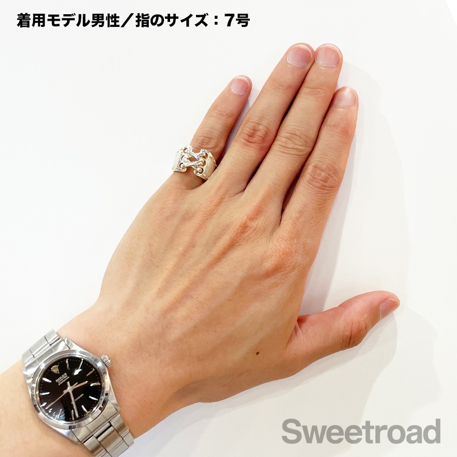 現行モデルには存在しない、珍しいデザインが採用されているエルメスの「メキシコリング」。本商品は人気のダブルの個体です。コルセットがモチーフとされた、エルメスらしいデザインが目を惹きます。男女ともに着用可能なユニセックスなアイテムです。51サイズですが、本商品はワイドサイズで楕円形状のモデルで、幅にボリュームがあるため、一般的なリングよりもきつめの装着感となります。目安としては9~10号程度となります。シルバー特有の小傷こそございますが、雰囲気を損なうようなダメージはございません。ブランド名や素材を表す刻印はしっかりと残っています。