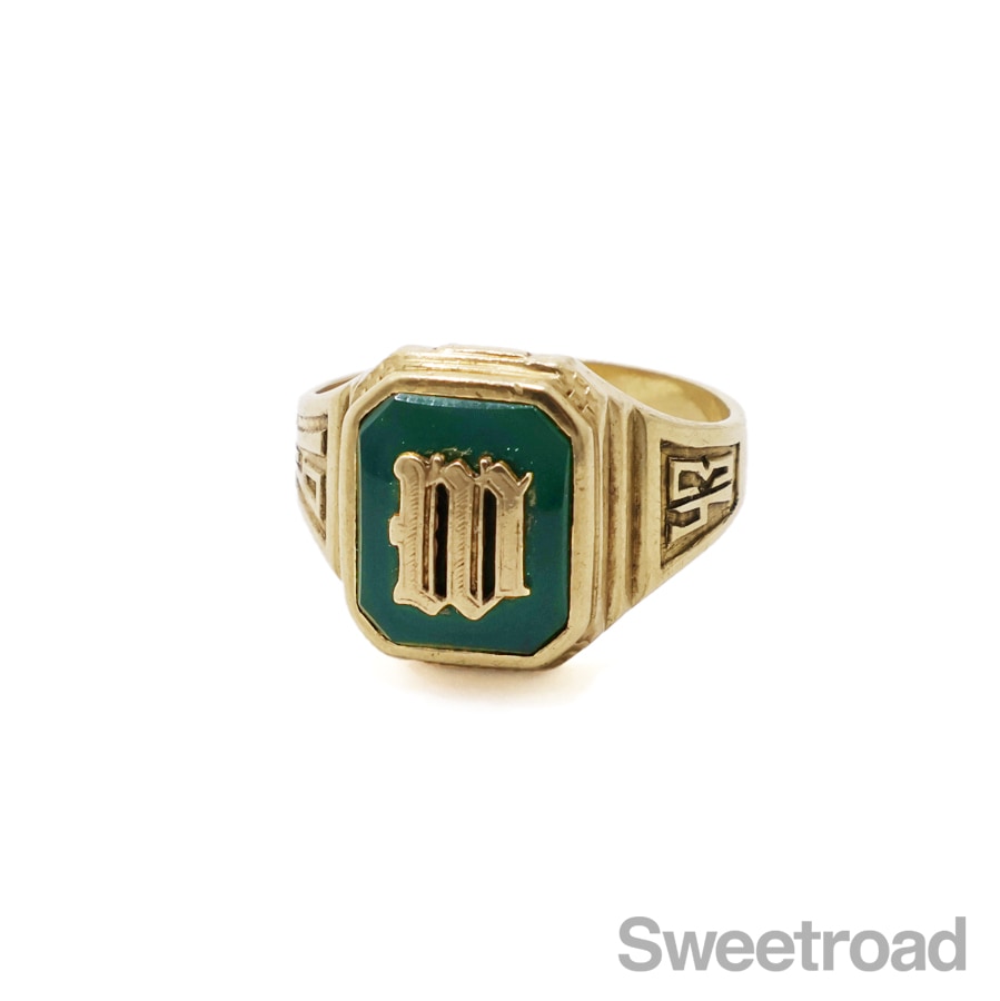 非常に珍しいダークグリーンの石に「M」のカリグラフィーフォントが配されたヴィンテージ感抜群な逸品です。