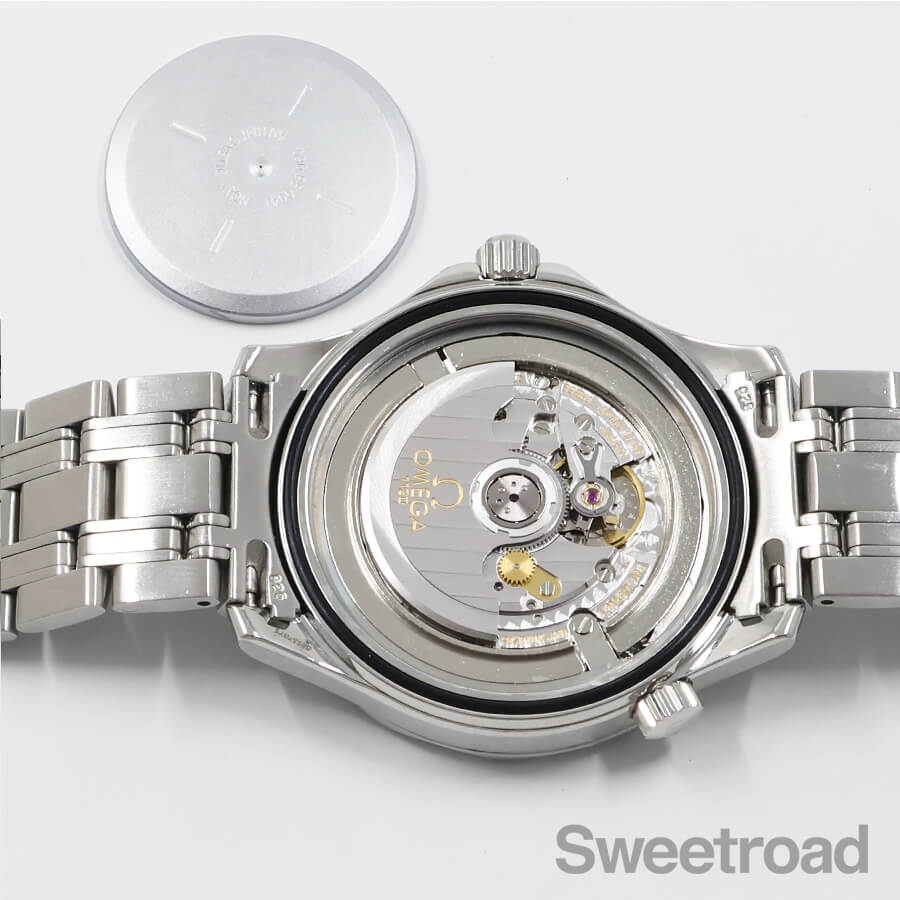 ベルトは、オメガ純正のステンレスブレスが装着されており、手首サイズ14.5cm~18.0cmの範囲で調整が可能です。