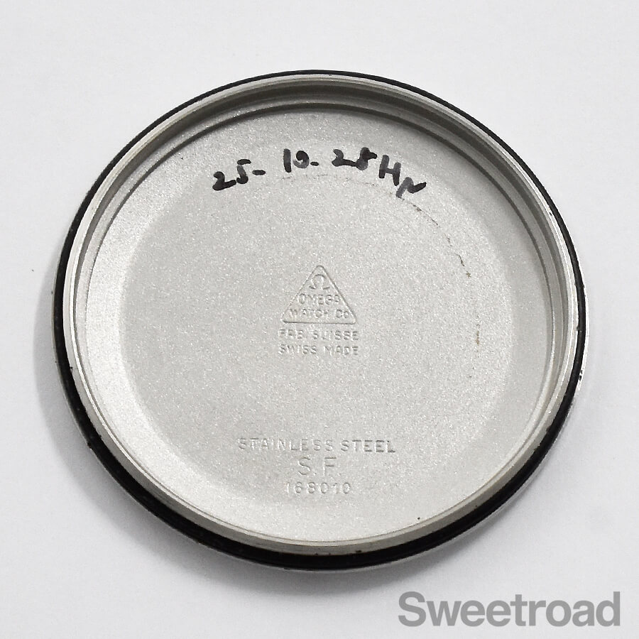 サイクロプスレンズ付きの純正風防が取り付けられており、中央付近には透かしでオメガマークが入っています。