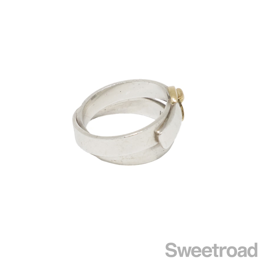 ベルトがモチーフになった、エルメスの「ダブルトゥルーリング」が入荷しました。 ベルトが二重に巻かれたデザインで、バックル部分に18金イエローゴールドが使用された高級感のあるコンビモデルです。シルバー特有の小傷こそございますが、雰囲気を損なうようなダメージは見られません。 ブランド名や素材を表す刻印もしっかりと残っています。
