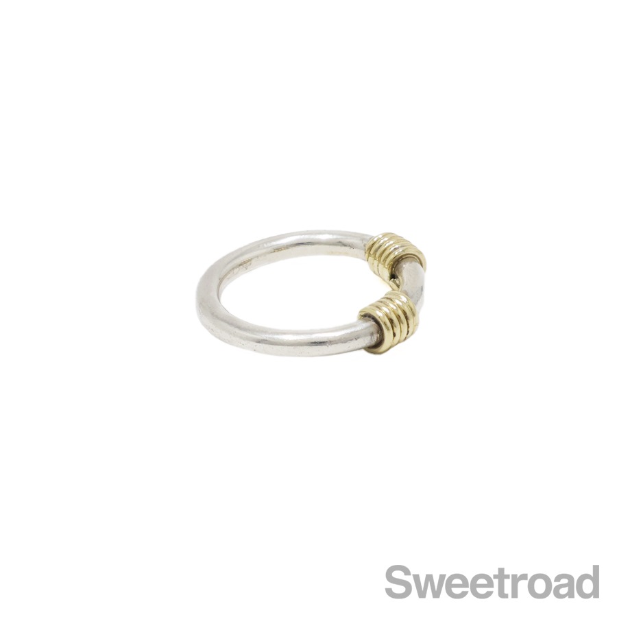 ティファニーの人気モデル「コイルリング」が入荷しました。 18金イエローゴールドと925シルバーが組み合わさったコンビ仕様で、ユニークなデザインが魅力的なユニセックスアイテムです。本商品は、幅が狭いため6〜7号くらいの装着感です。シルバー特有の小傷こそございますが、全体的に目立つようなダメージはございません。ブランド名や素材を表す内側の刻印はしっかりと残っています。