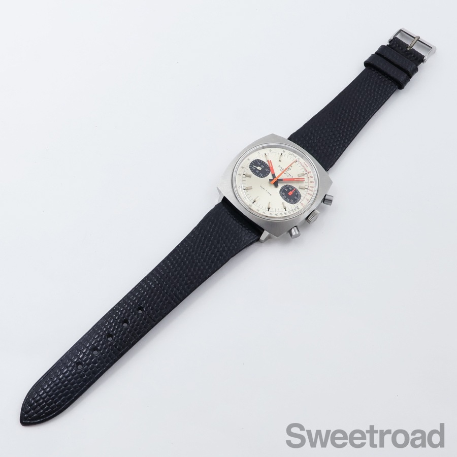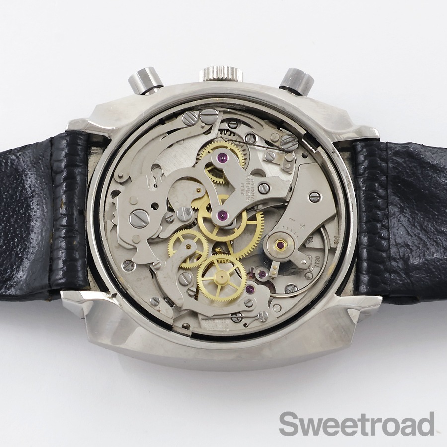 ムーブメントは手巻きクロノグラフ「バルジューCal.7730(ヴィーナスCal.188)」を搭載。 (ヴィーナス社で誕生した「Cal.188」は、バルジュー社に買収されたことによって基本構造はほとんど同じですが「Cal.7730」という名に変わり、ほどなくして改良機である「Cal.7733」へ切り替わります。そのため、「Cal.7730」においては市場での流通数も多くはなく、今となっては希少な存在と言えます。)