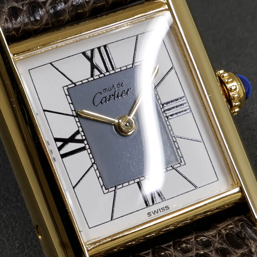 ホワイトとグレーのツートンダイヤルに、大きめのローマン数字が配された、カルティエらしい上品なダイヤルデザインが目を惹きます。