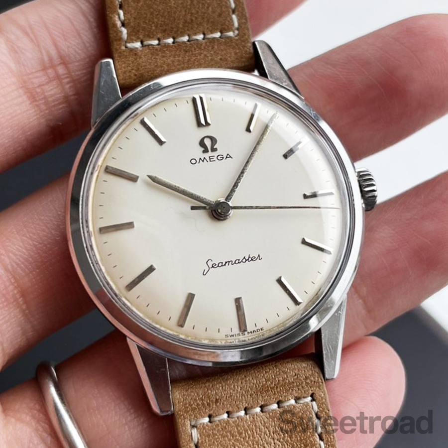 夜光を持たないスッキリとしたノンデイトフェイスが目を惹く逸品で、クリーム色に灼けた文字盤の雰囲気が魅力的です。