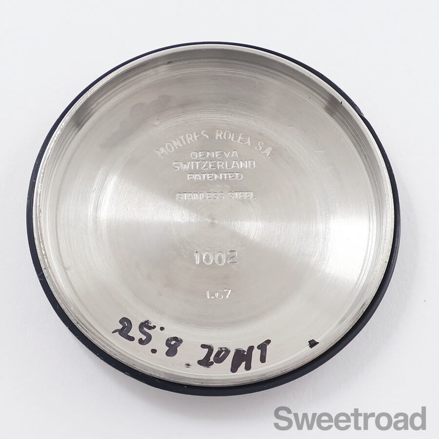 裏蓋内側の刻印は「Ref.1002」仕様。※当時、ロレックスはケースと裏蓋を別々に製造しており、同型のケースが採用されている5500(エアキング)に1002の裏蓋が使用されているパターンは多く見受けられます。