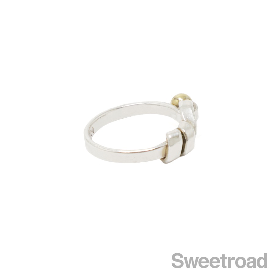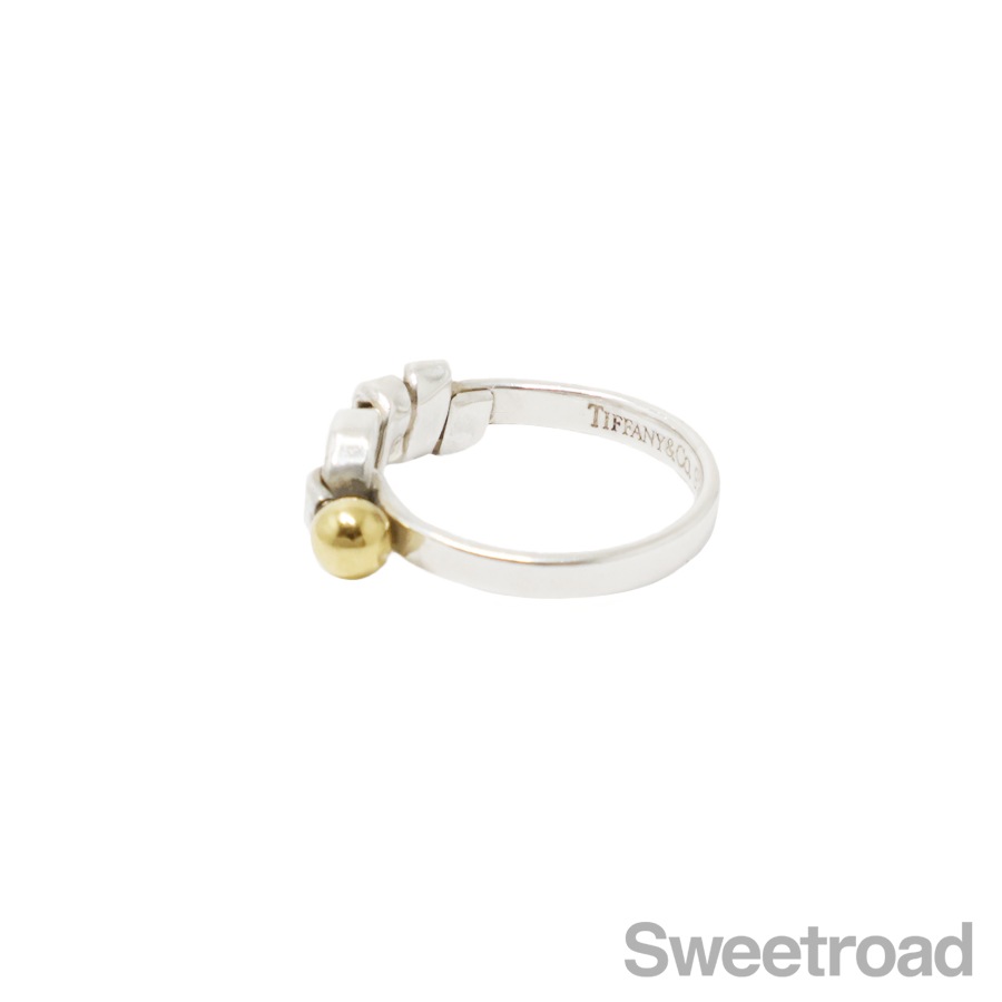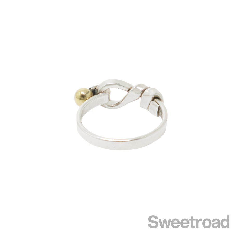 ティファニーコレクションの中でも高い人気を誇る「フックアンドアイシリーズ」の「フラットワイヤーリング」。ティファニーならではの独創的なデザインに、さりげなく主張する18金イエローゴールドが印象的なアイテムです。お揃いのバングルと身につけるのもおすすめです。シルバー特有の小傷こそございますが、全体的に目立つようなダメージは見られません。内側の刻印はしっかりと残っています。
