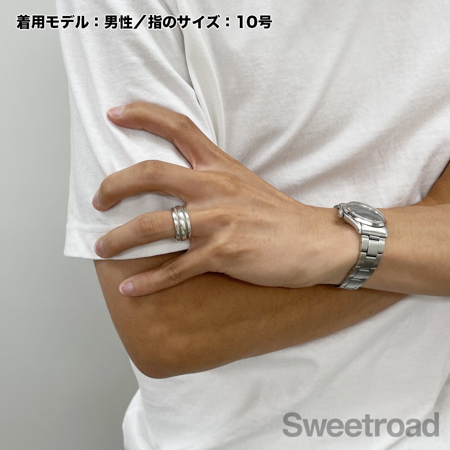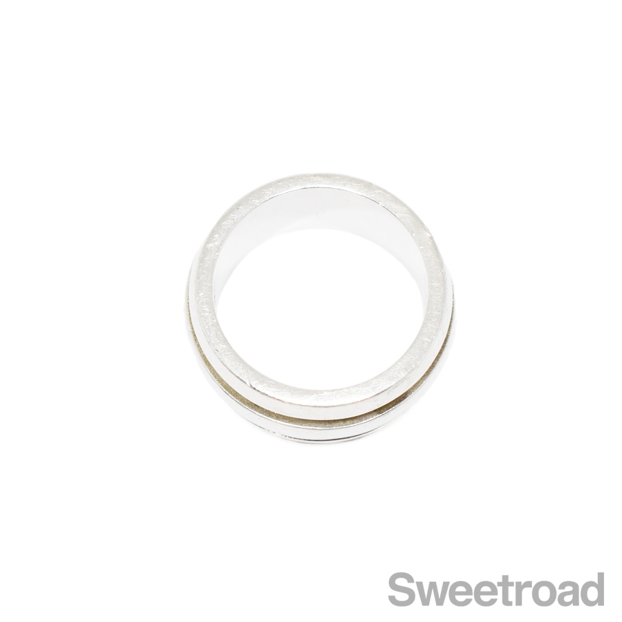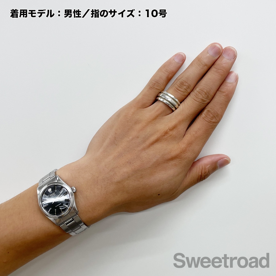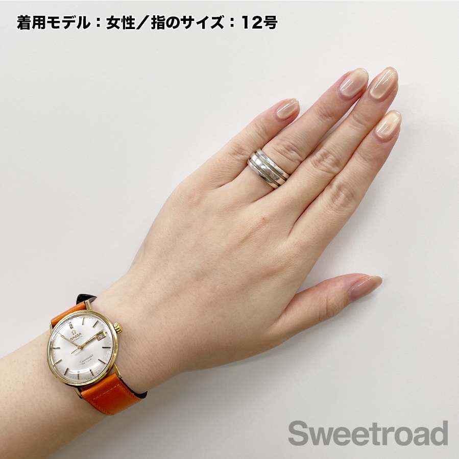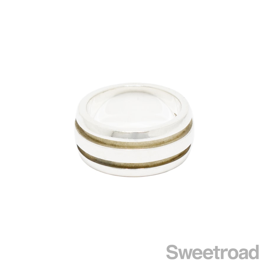 1995年にリリースされ、現在は廃盤となっている「グルーブドリング」が入荷しました。ボリュームと存在感がありますが、どんなスタイルにも馴染みやすいシンプルなデザインが魅力的です。 本商品は幅が広いため、11〜12号くらいの装着感です。 シルバー特有の若干の小傷こそございますが、雰囲気を損なうようなダメージは見られません。内側の刻印はしっかりと残っています。