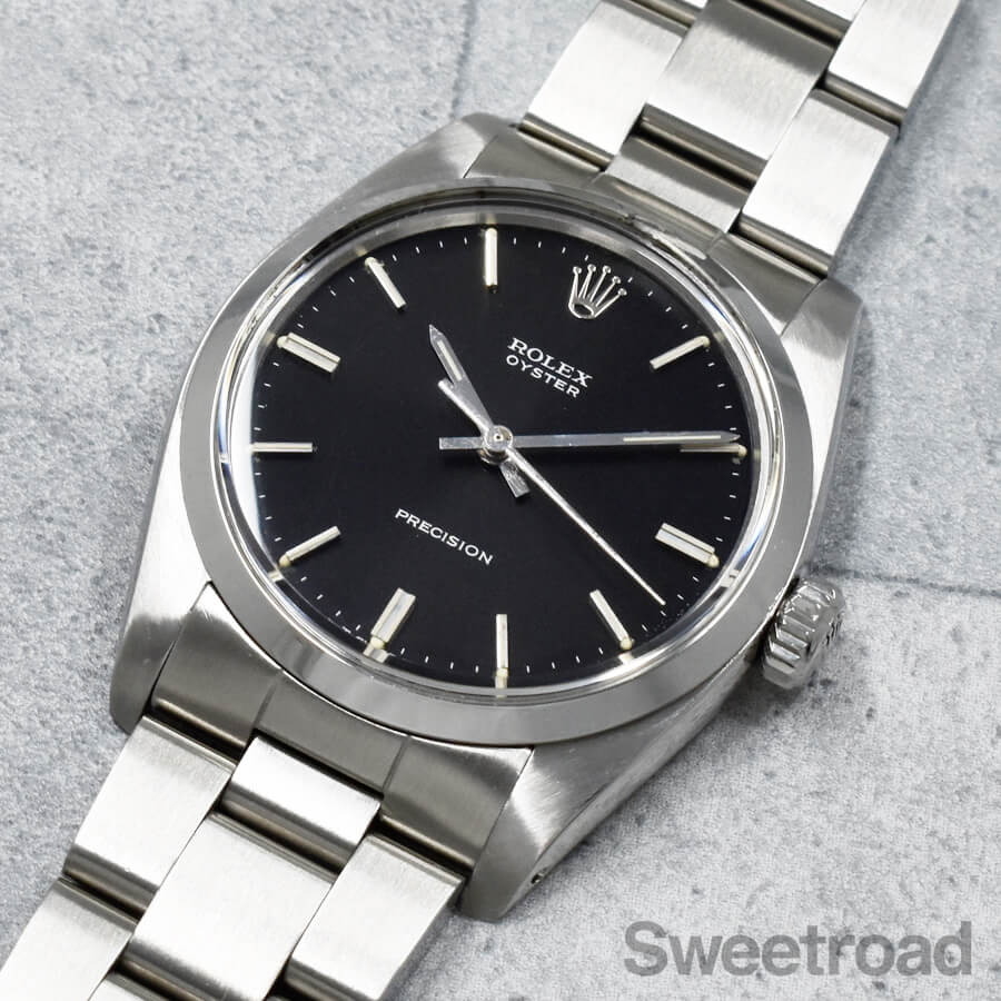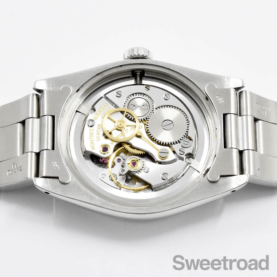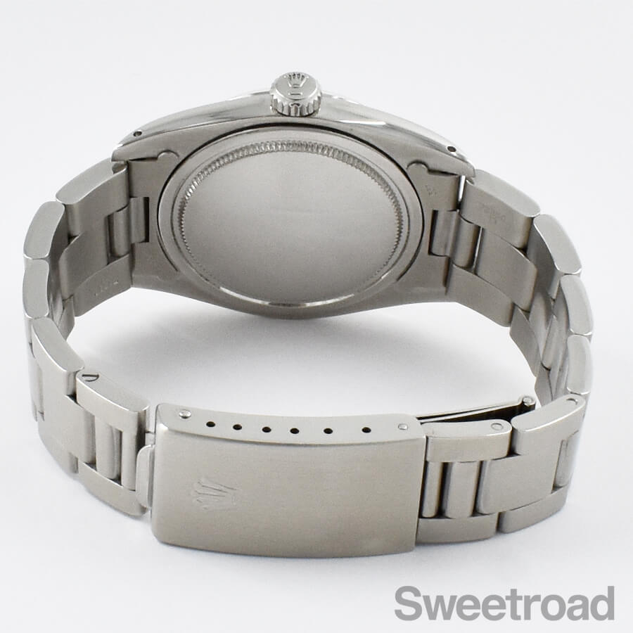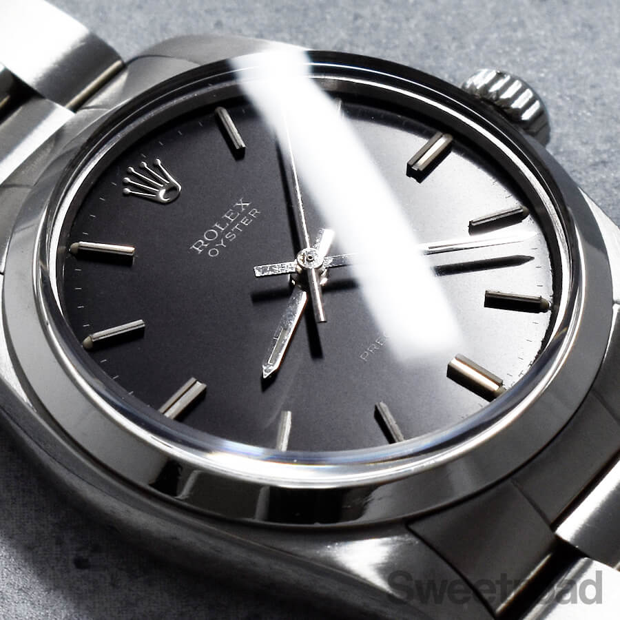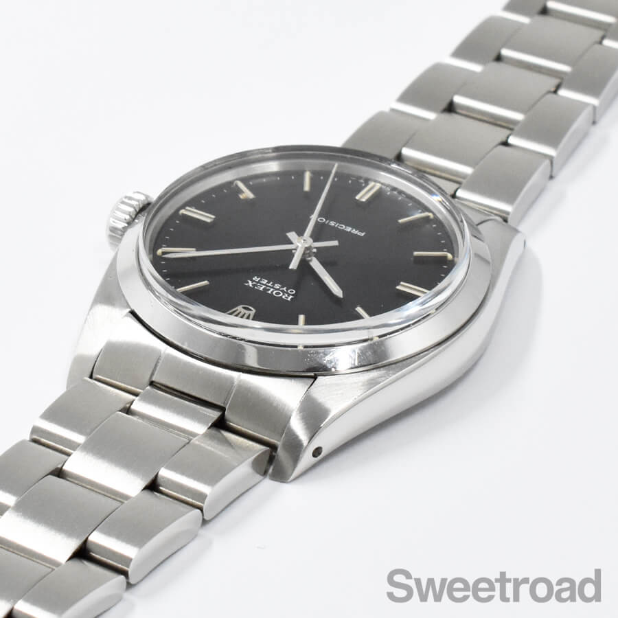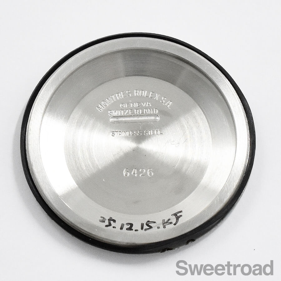 1950年代から1980年代後半まで製造された、ロレックスのロングセラーモデル「オイスター/Ref.6426」。 1985年に製造された最後期の個体が入荷しました。 文字盤は、80年代特有のしっとりとした光沢感が目を惹く、オリジナルブラックダイヤル。 インデックス周りにほんのわずかな傷みが見受けられる程度で、全体的に綺麗な状態を維持しています。 針にはわずかな経年はございますが、着用時に目立つほどではありません。 ミドルケースには後年に仕上げが施されているため、ダメージの少ない綺麗な状態です。 過度なケース痩せや丸みも見られず、オイスターケースのプロポーションも保たれています。 ムーブメントは、手巻きの名機「Cal.1225」を搭載。 ベルトは、ロレックス純正ハードブレス(1986年製)が装着されており、ケースとほぼ同年式の貴重な組み合わせです。 当店にてOH(分解掃除)を行っております。