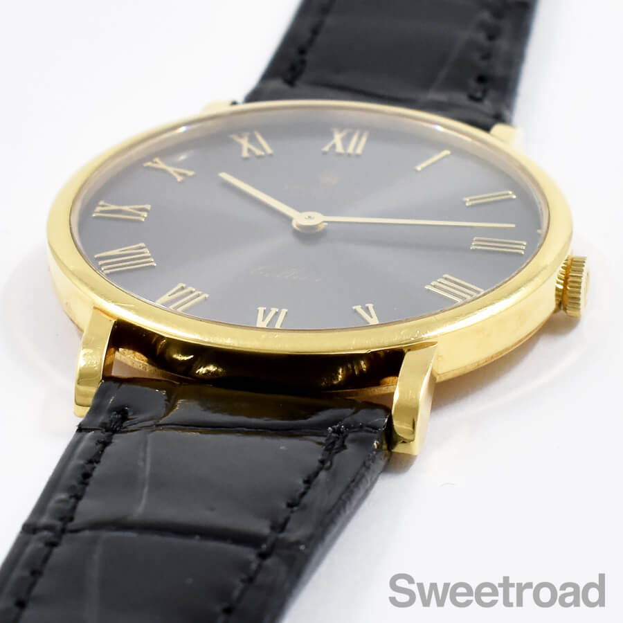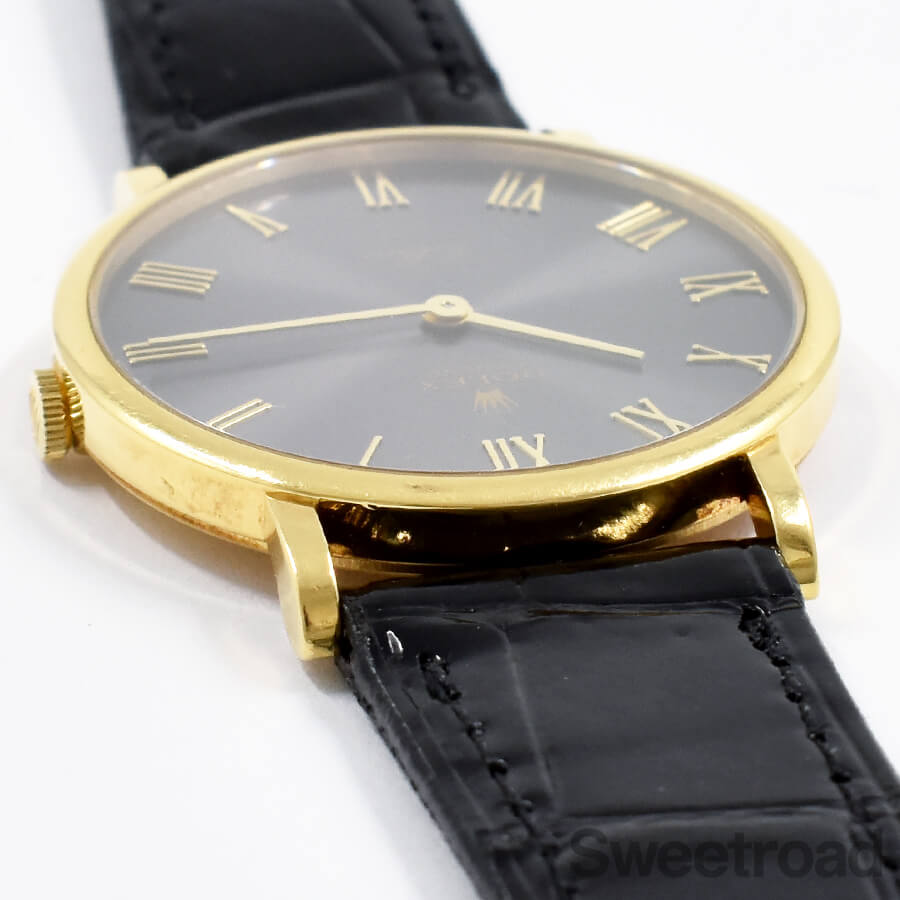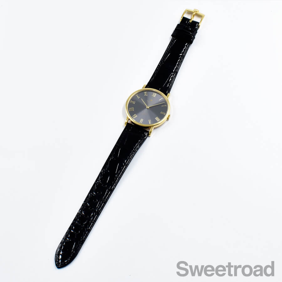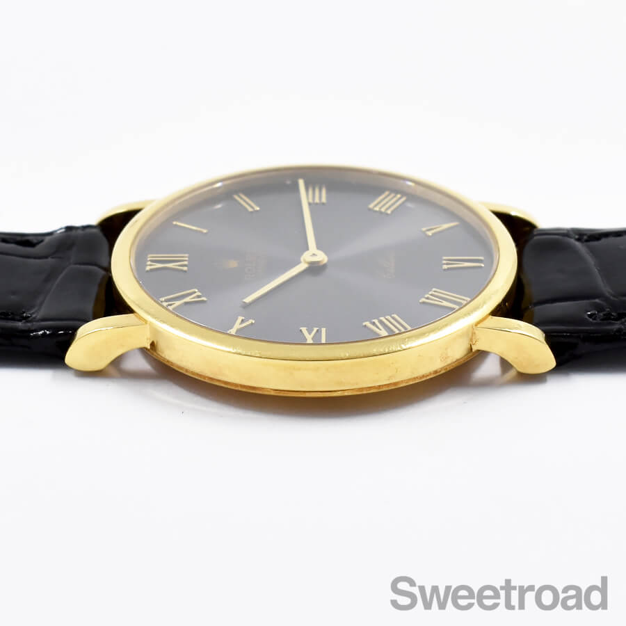 本商品は、18金イエローゴールド製の薄型ラウンドケースに、2針仕様のダイヤルが採用されたドレッシーな雰囲気が目を惹く一本です。