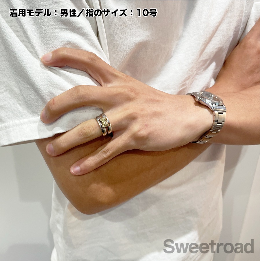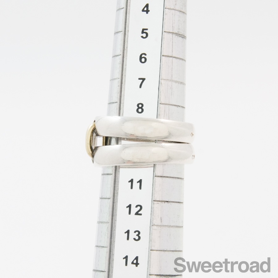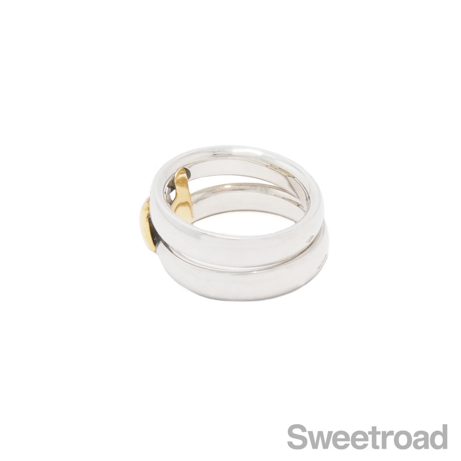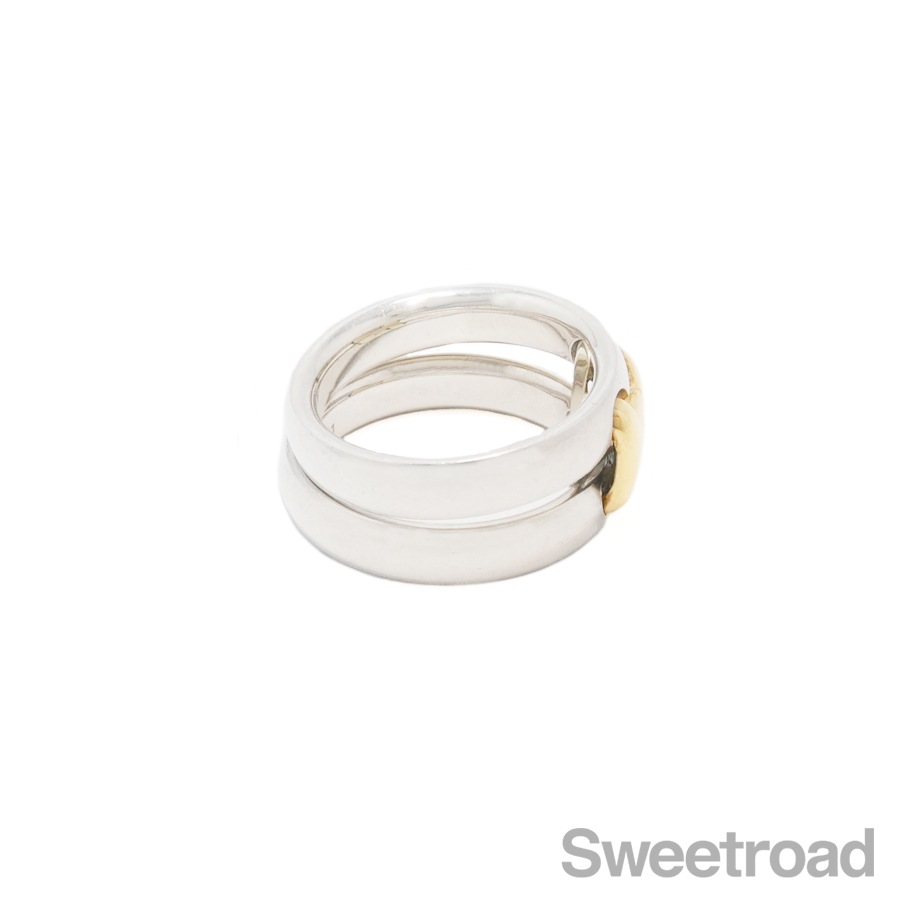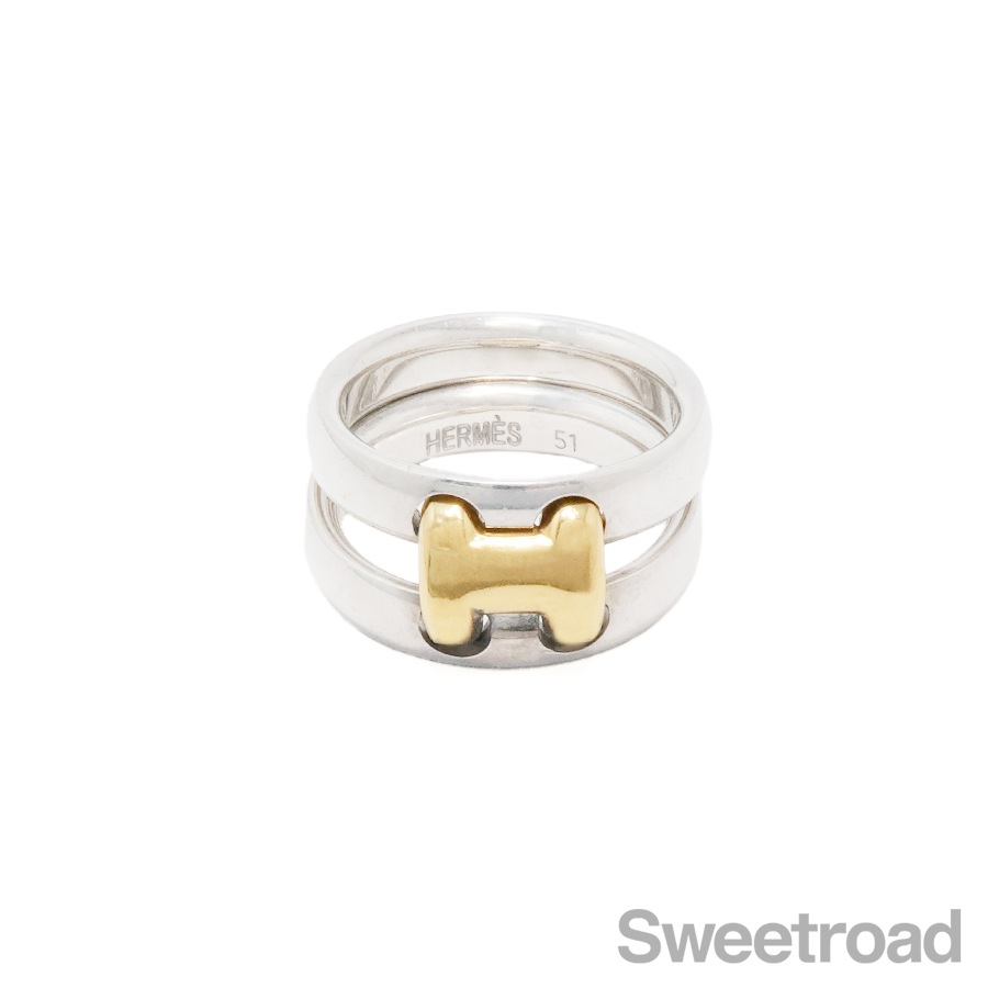 ポップなフォルムのHロゴが印象的な「エルメス・オランプリング」。1980年代に誕生したこちらのモチーフは、現在ではヴィンテージでしか手に入らない希少性の高いモデルで、男性でも女性でも着用しやすいユニセックスなアイテムです。18金イエローゴールドとシルバーのコンビ仕様で、流行遅れになることなく永く身につけることができます。 51サイズですが、Hロゴ部分の凹凸やリングが二重になっているため、9〜10号くらいの装着感です。シルバー特有の若干の小傷こそございますが、目立つような過度なダメージは見られず、内側の刻印もはっきりとしています。