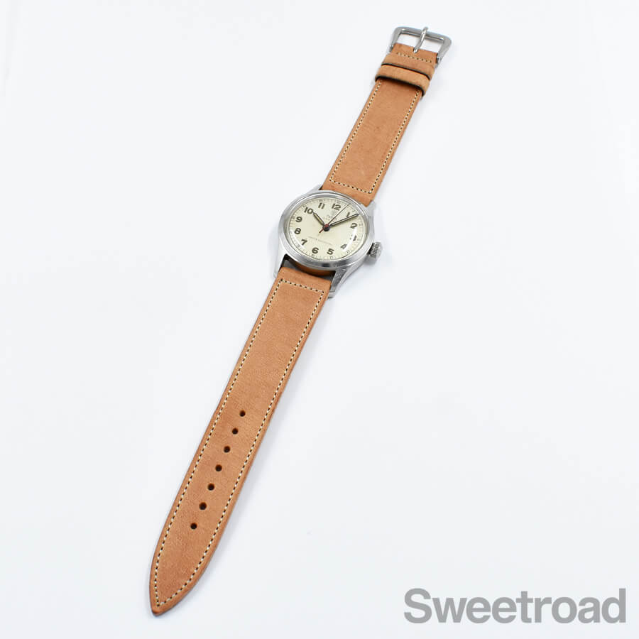 アラビアインデックスやミニッツスケール、ブルースチール仕様の針や赤秒針など、小さな文字盤の中にオールドなディテールが詰まった魅力的な顔立ちです。