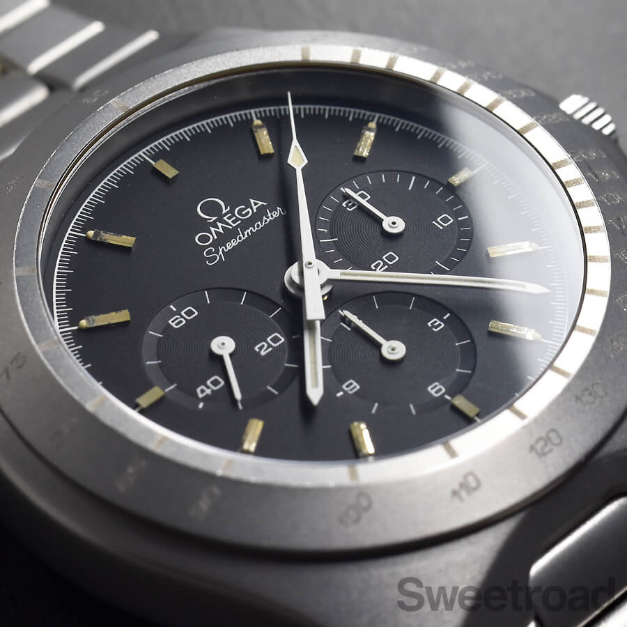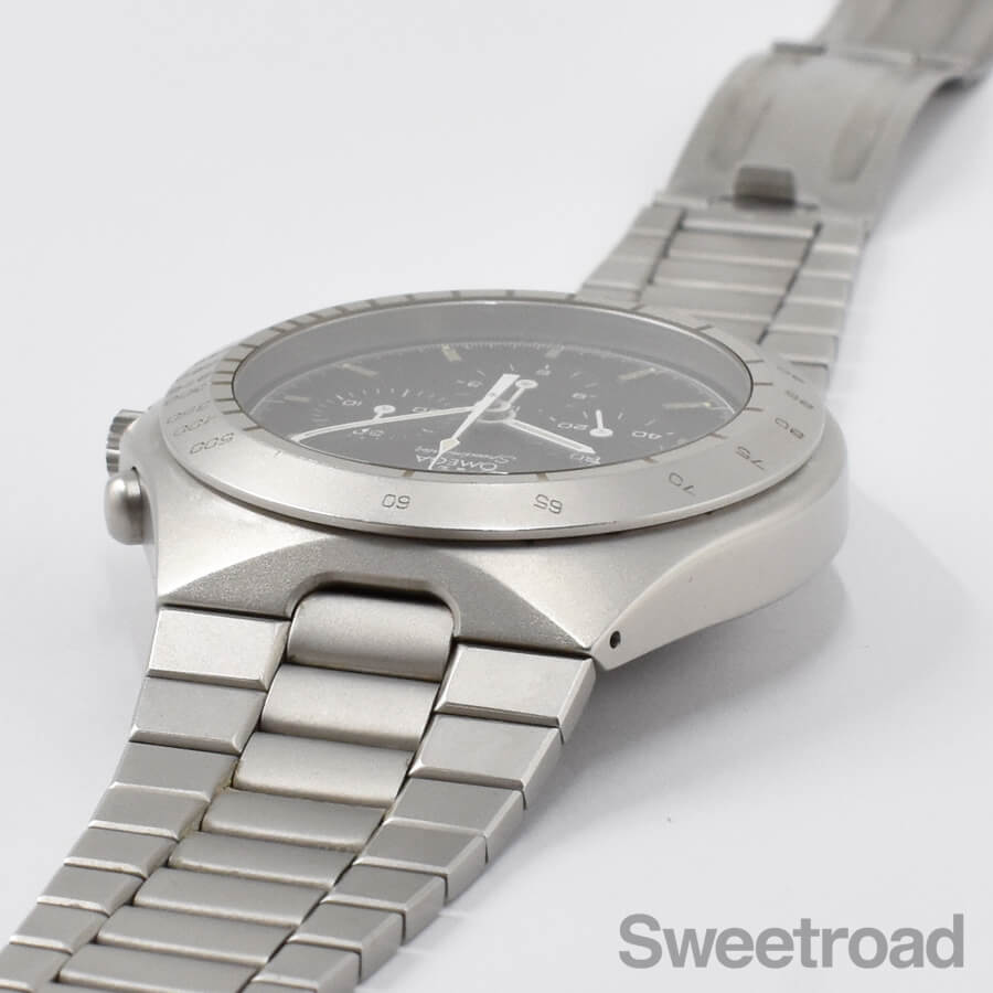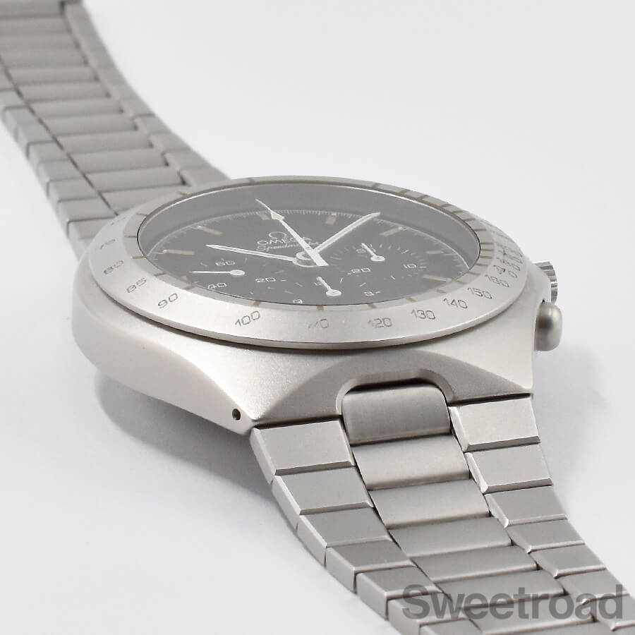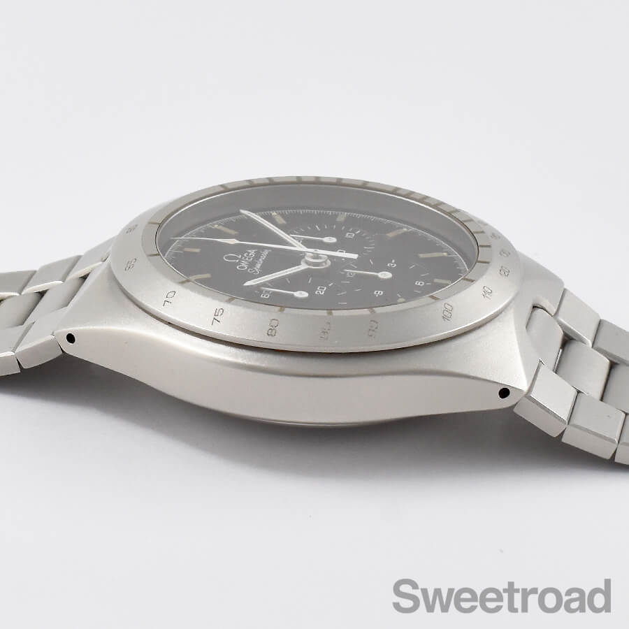 通常のスピードマスターとは異なる丸みを帯びたスペーシーデザインが目を惹くモデルで、他のモデルにはない独特な存在感を放っています。