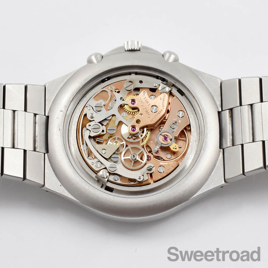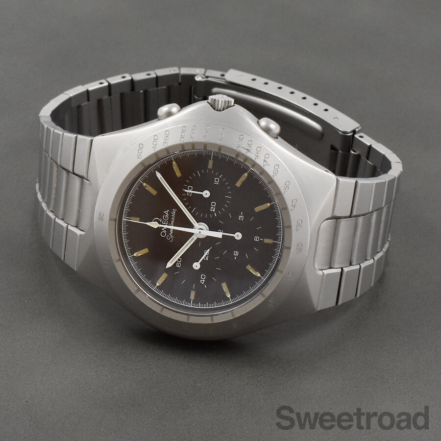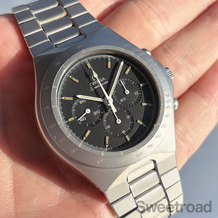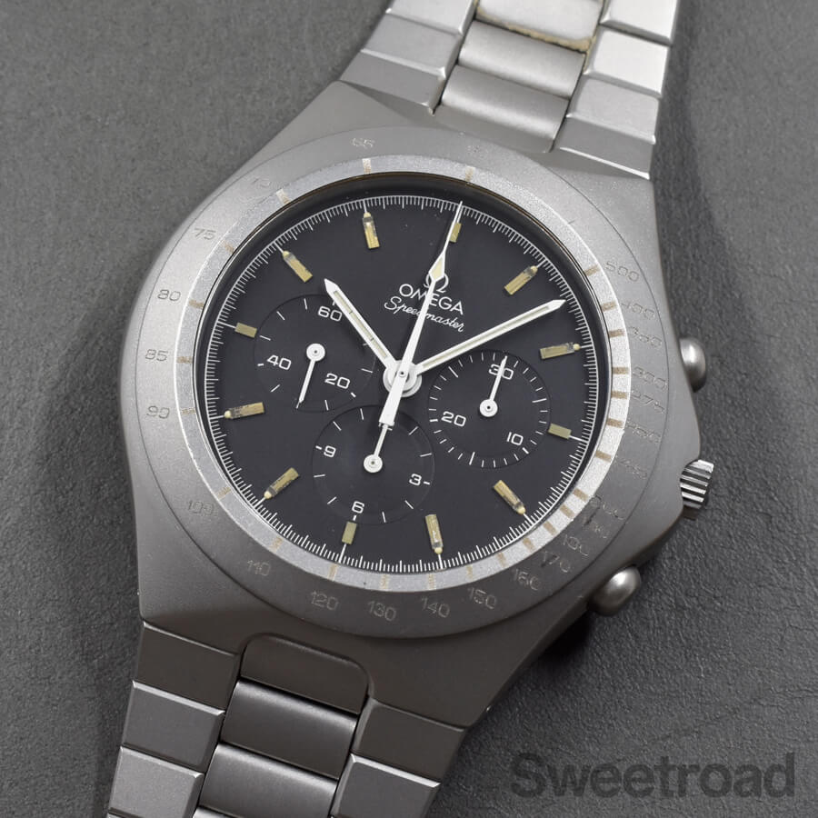通常のスピードマスターとは異なる丸みを帯びたスペーシーデザインが目を惹くモデルで、他のモデルにはない独特な存在感を放っています。