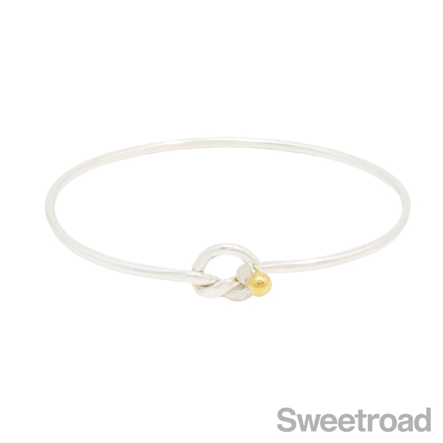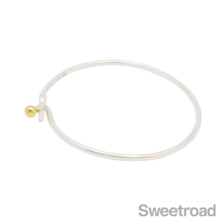 ティファニーコレクションの中でも高い人気を誇る「フックアンドアイシリーズ」より「ラブノットバングル」が入荷しました。 925シルバーと18金イエローゴールドが組み合わさった高級感のあるコンビモデルです。手首周り16.0cmくらいまでの方であれば余裕を持って身につけることができます。シルバー特有の若干の小傷がございますが、過度なダメージは見られません。内側の刻印はしっかりと残っています。